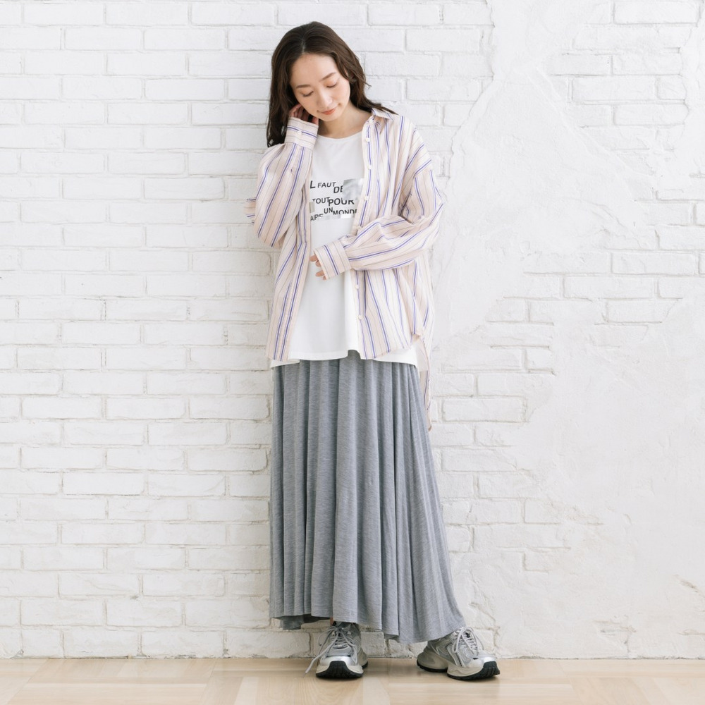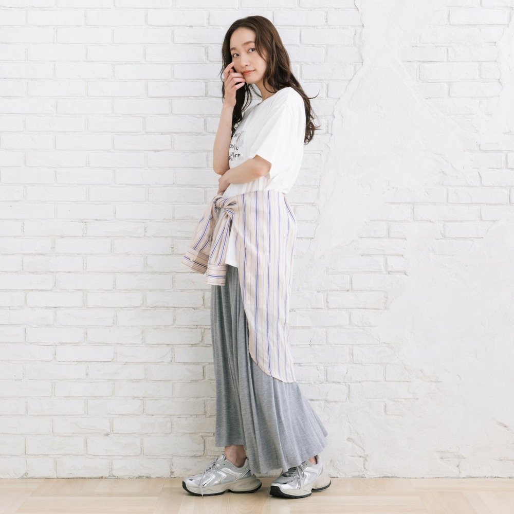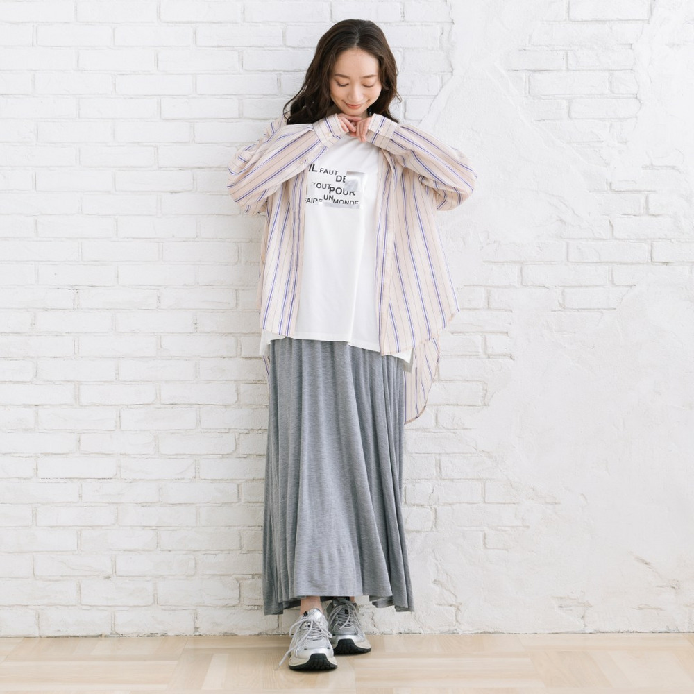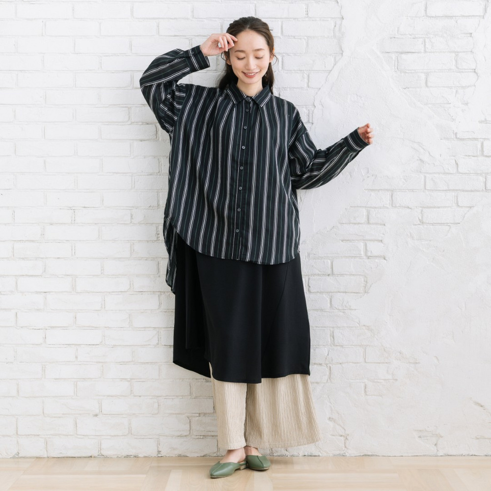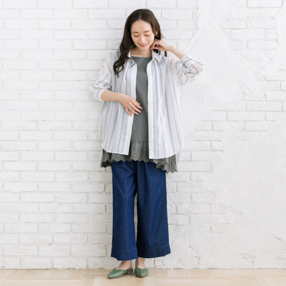 ゆったりとしたシルエットで体のラインを拾いにくく、リラックス感のある着心地に。