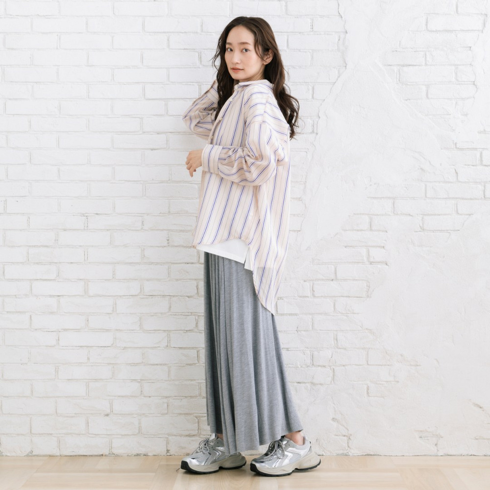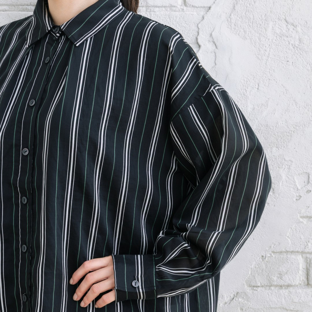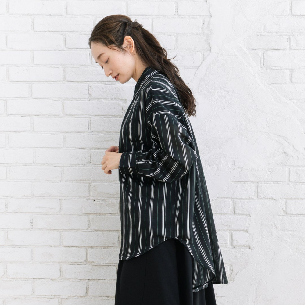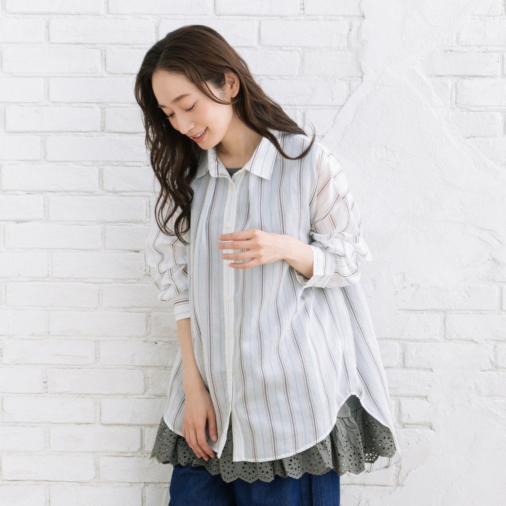 ほんのり透けるシアー素材にストライプ柄をのせた、涼しげな印象のシャツ。