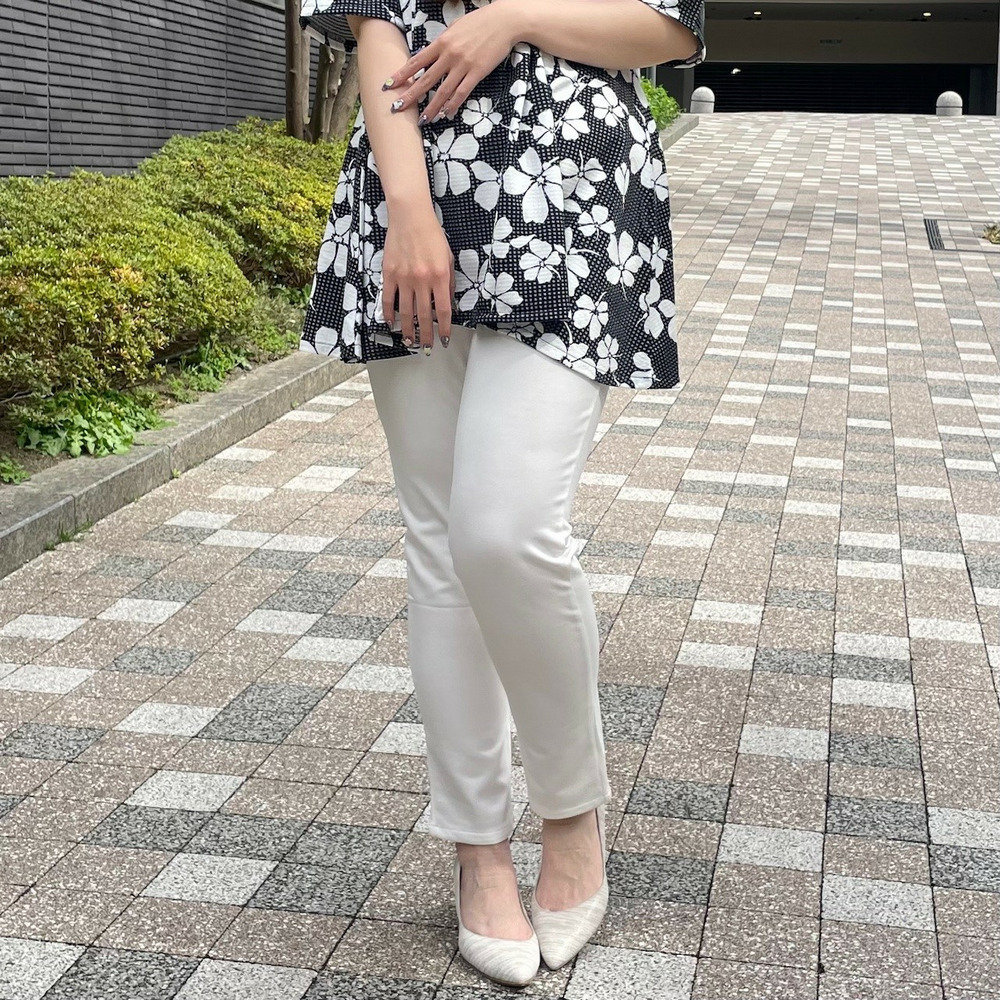 すっきり細見えする裾すぼまりシルエットは、チュニックやワンピースとのレイヤードスタイルにぴったり。