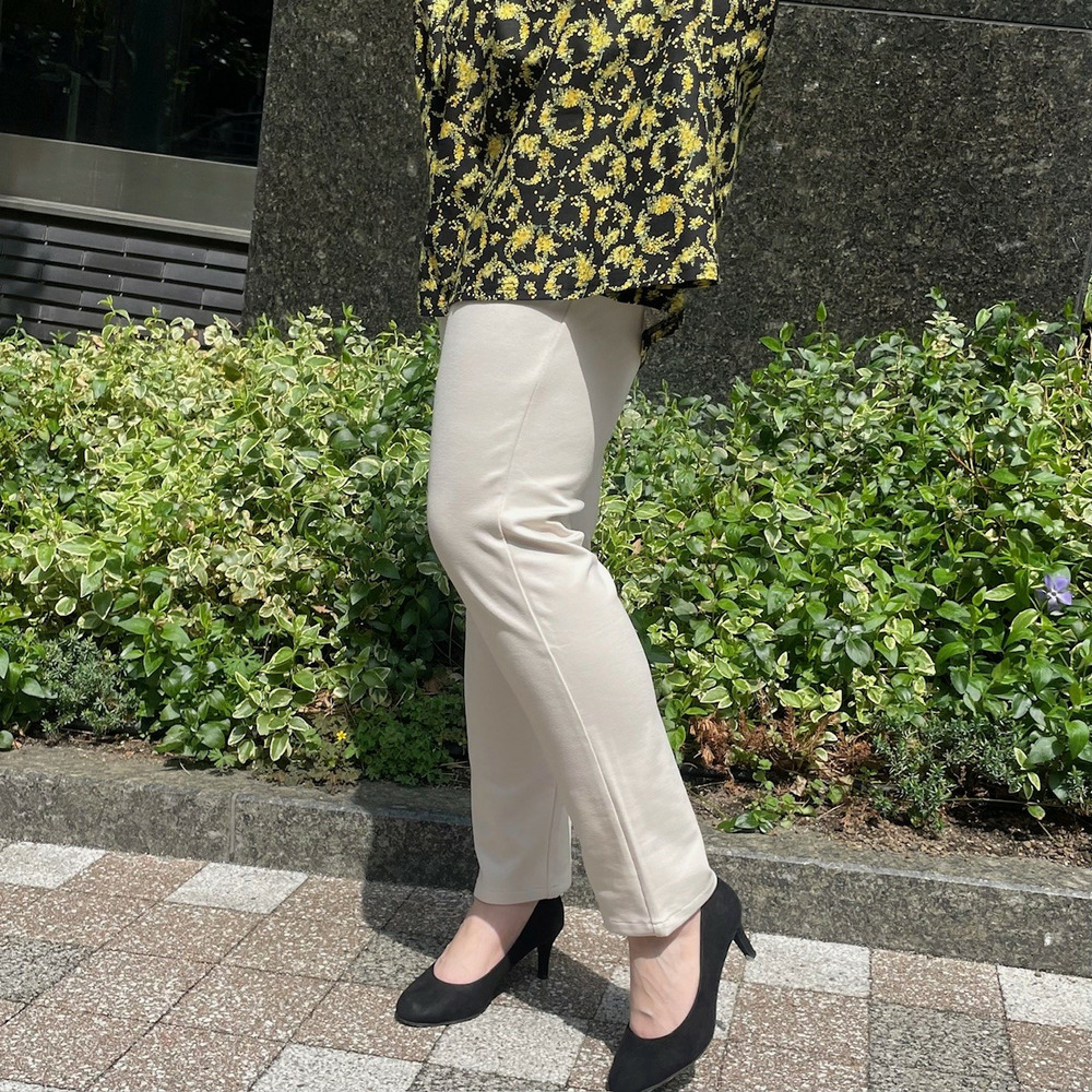 裾すぼまりの細身シルエットで脚スッキリ見せ
