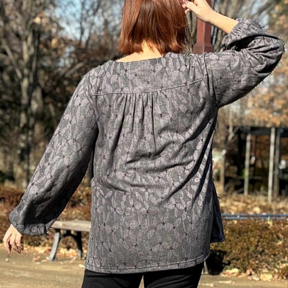 背中の切替部分には細かなギャザーを施し、ふんわりと広がるシルエットに。