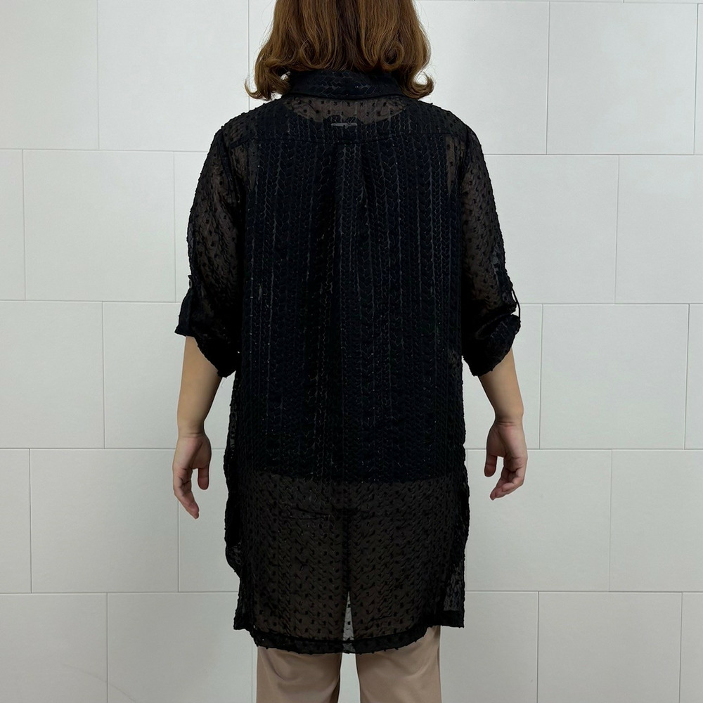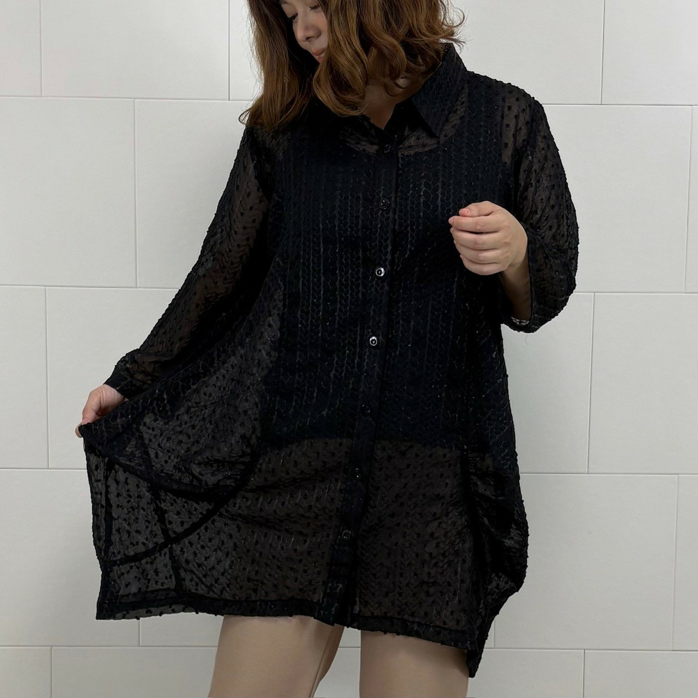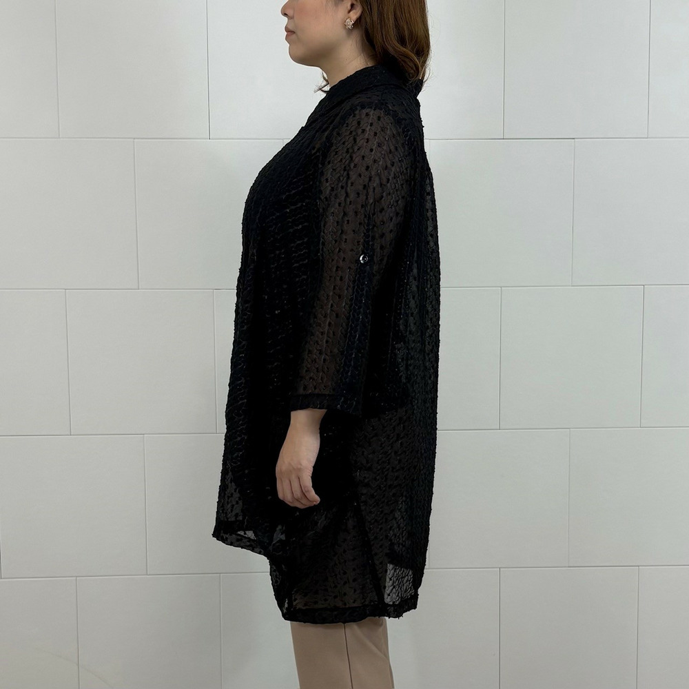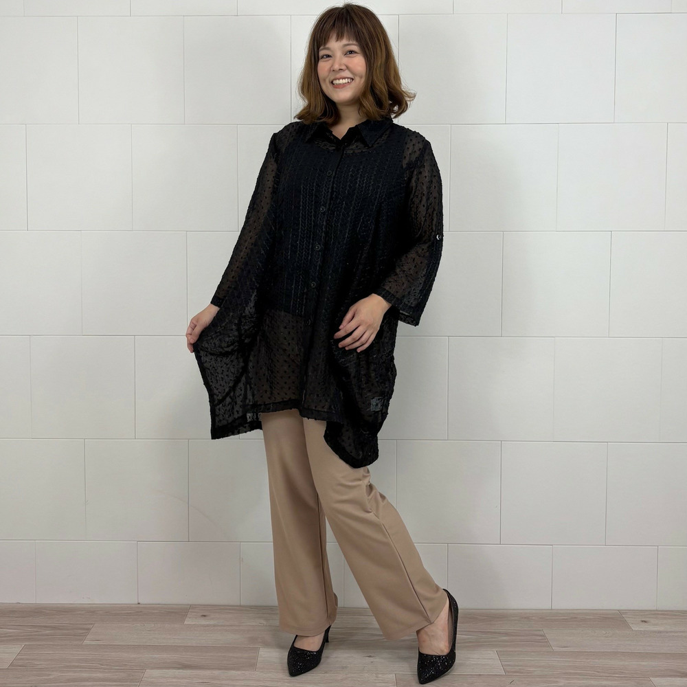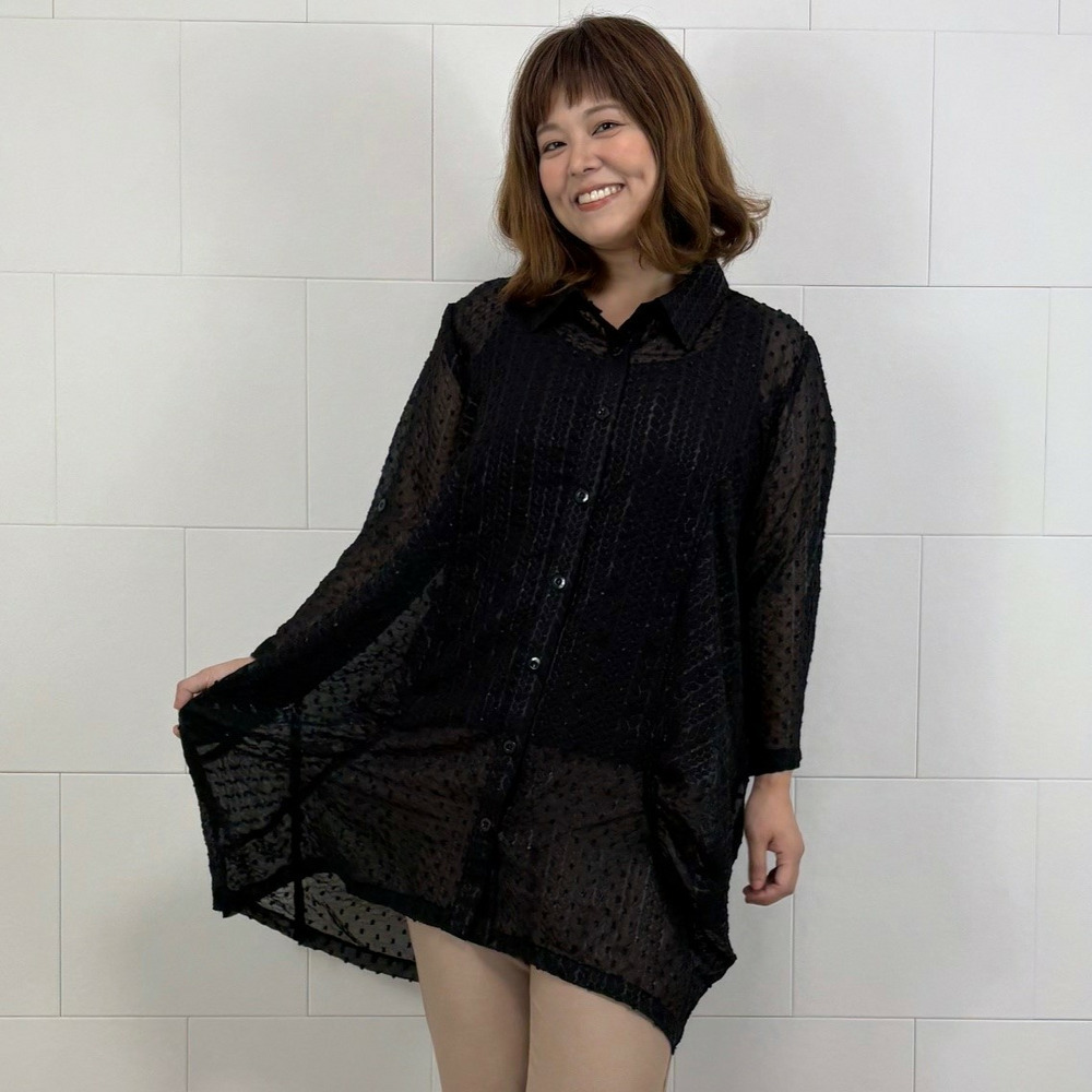 程よい透け感が大人の甘さをプラスし、抜け感と品のよさを兼ね備えた大きいサイズ対応シアーシャツチュニック。