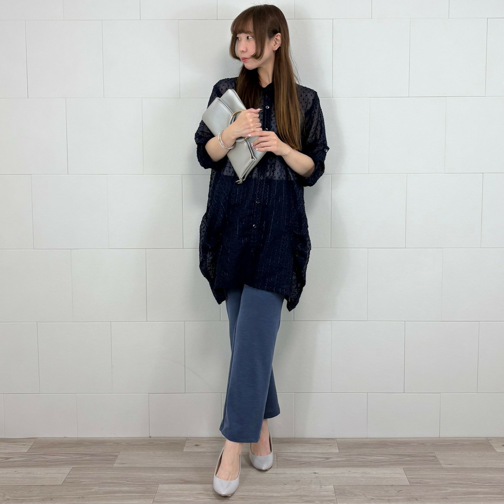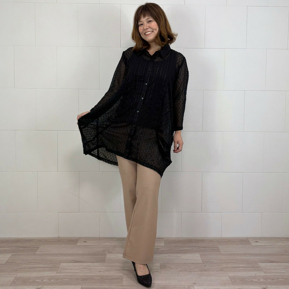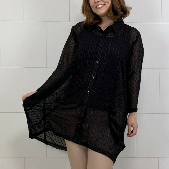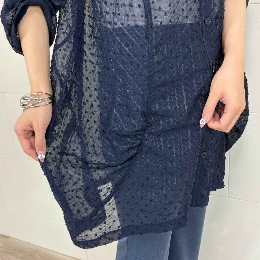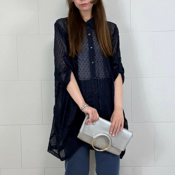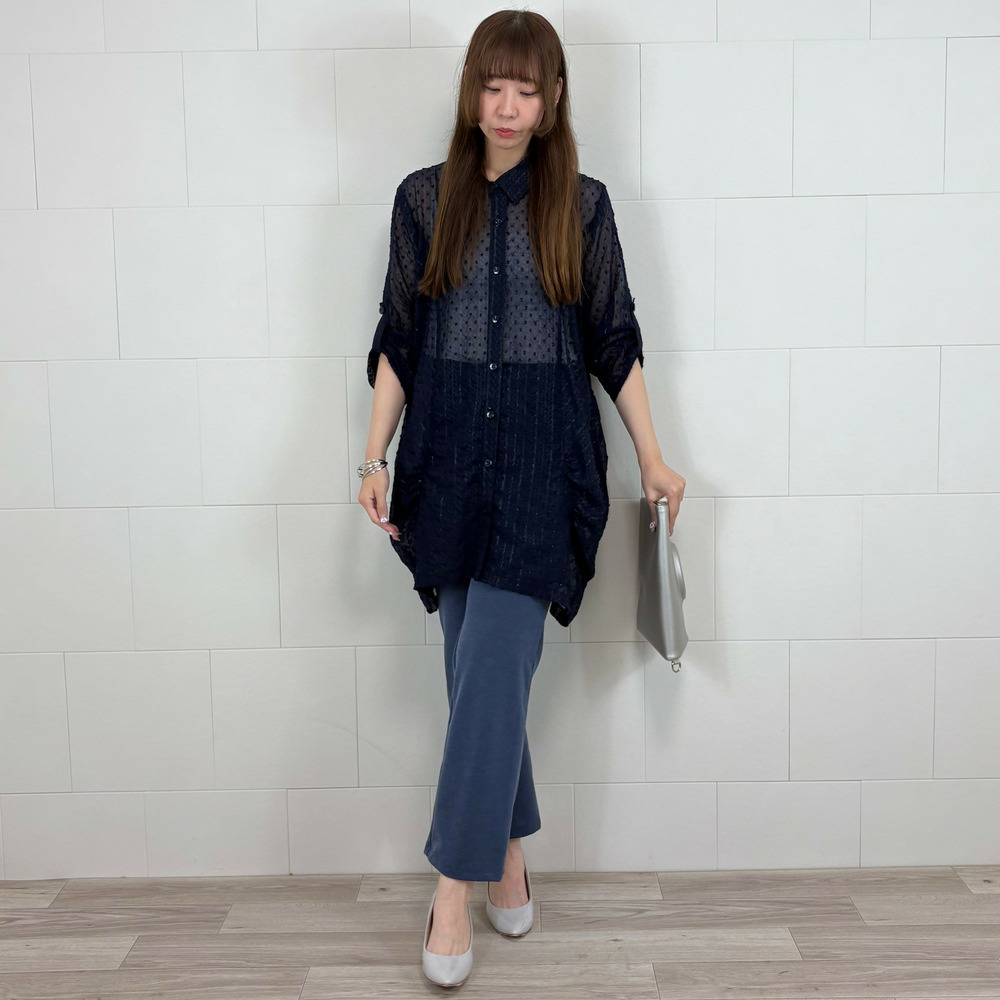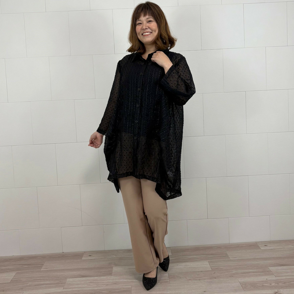 程よい透け感が大人の甘さをプラスし、抜け感と品のよさを兼ね備えた大きいサイズ対応シアーシャツチュニック。