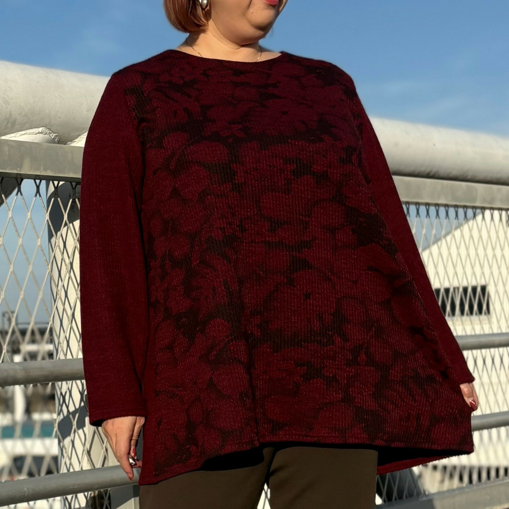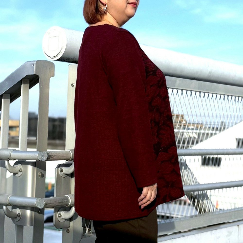 シックな花柄と針抜き編み地の表情が魅力の、軽やかに着こなせる大人チュニック。