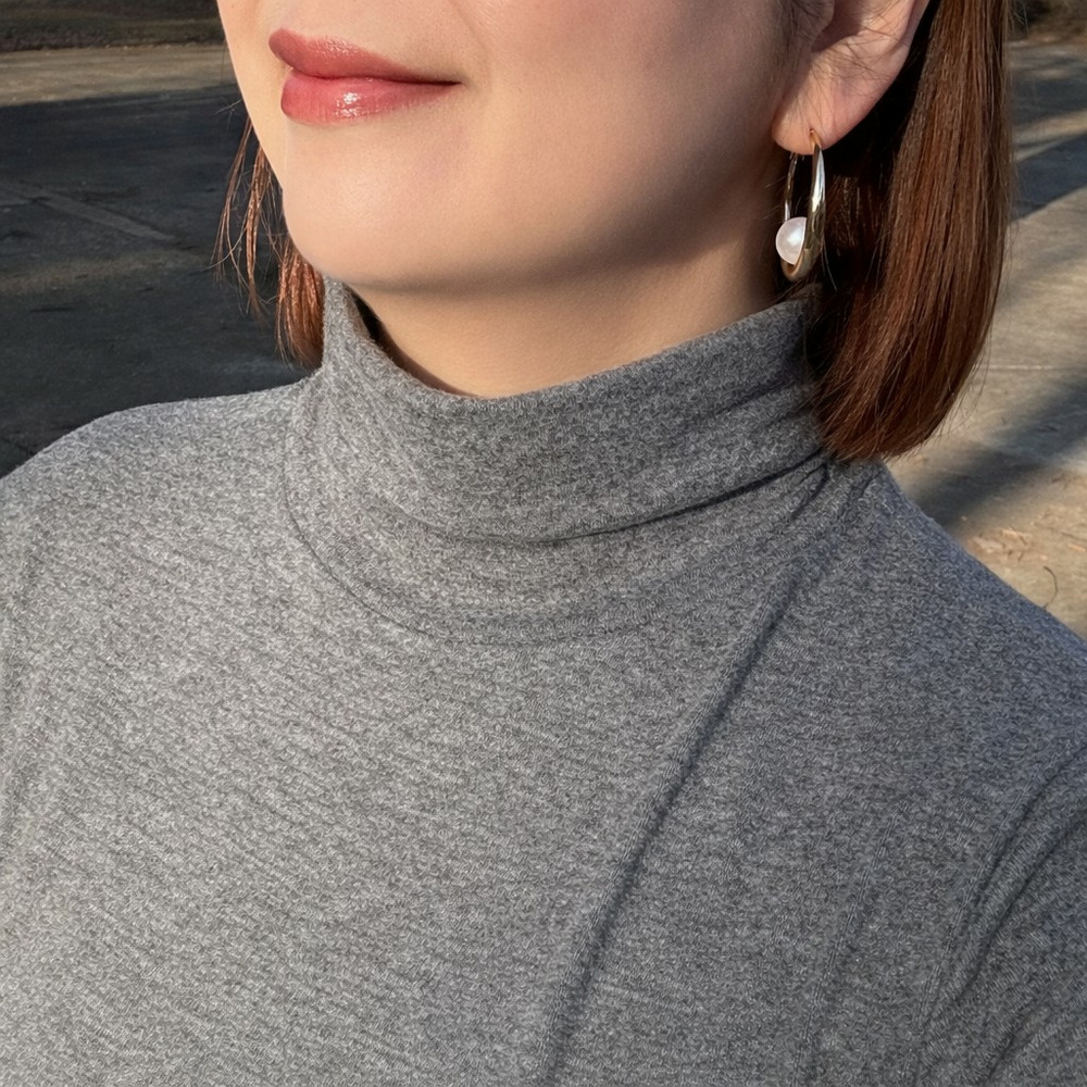 単調になりがちなタートルネックに表情を与え、首元をやさしく包み込みます。ジャケットやニットのインナーとしてももたつかず、