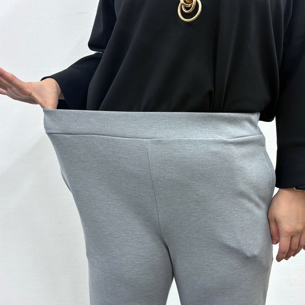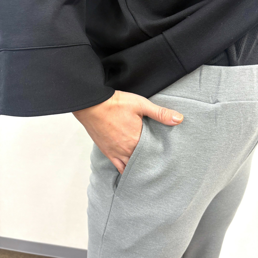 ポリエステルの機能性を兼ね備えたダブルニット素材のパンツ。