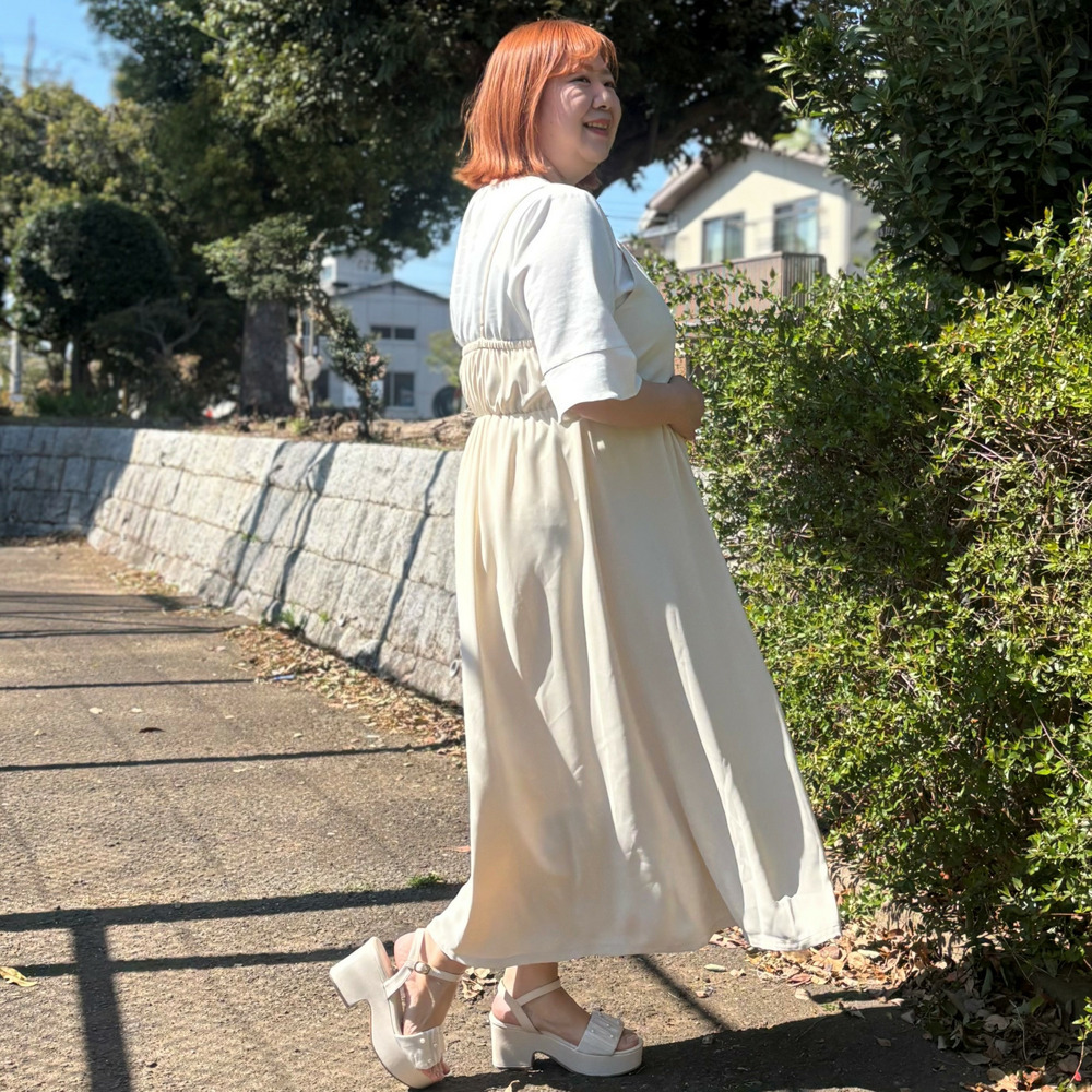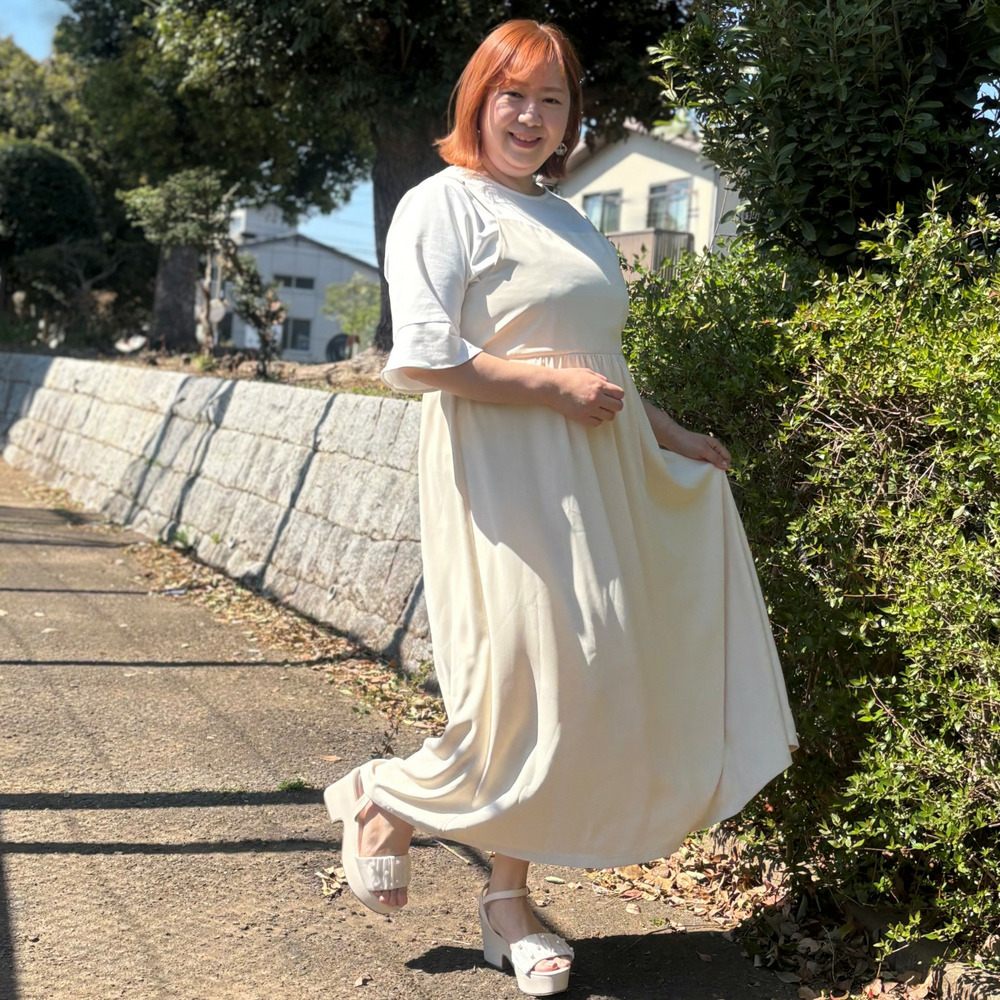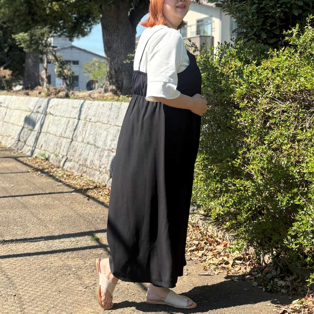 お腹まわりやヒップラインをさりげなく隠しながら、リラックス感ときれい見えを両立します。