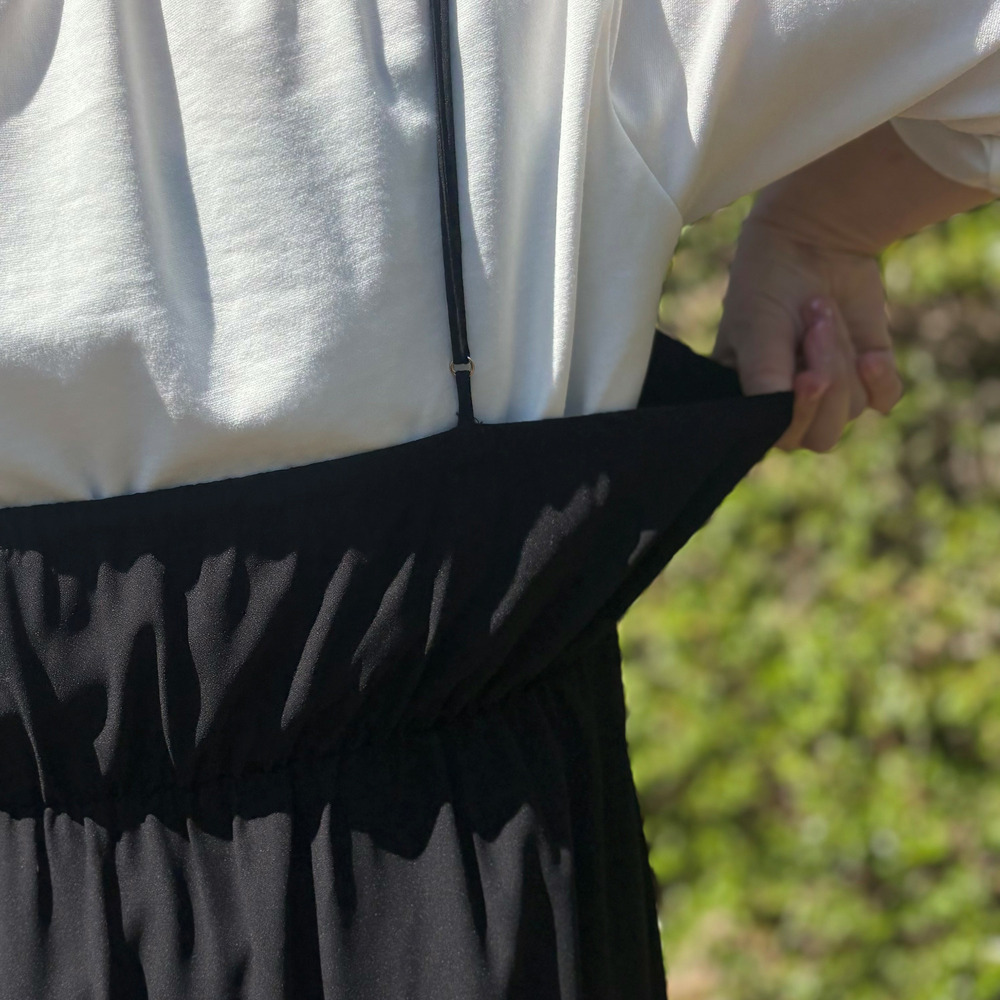 広がりすぎないストレート寄りのシルエットが、体のラインを拾いにくく自然にカバー。