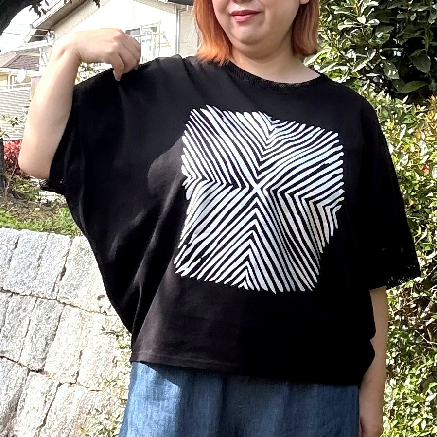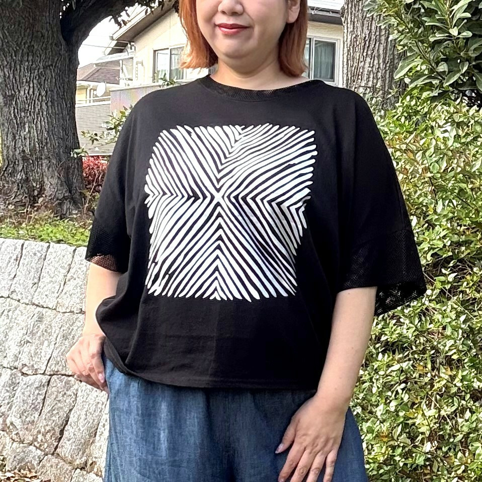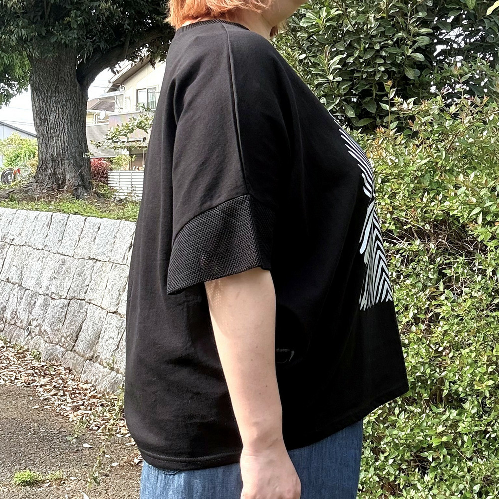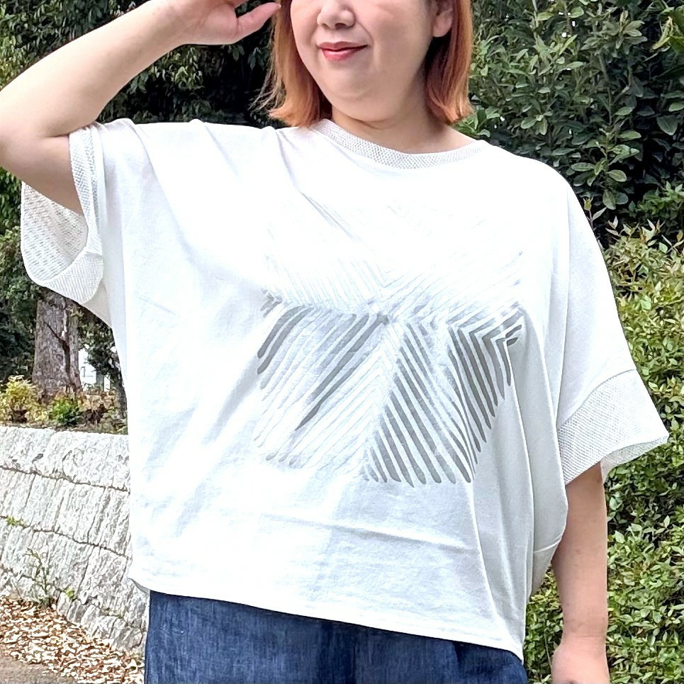 [3L・7L]メッシュ使い箔プリントドルマンスリーブプルオーバー