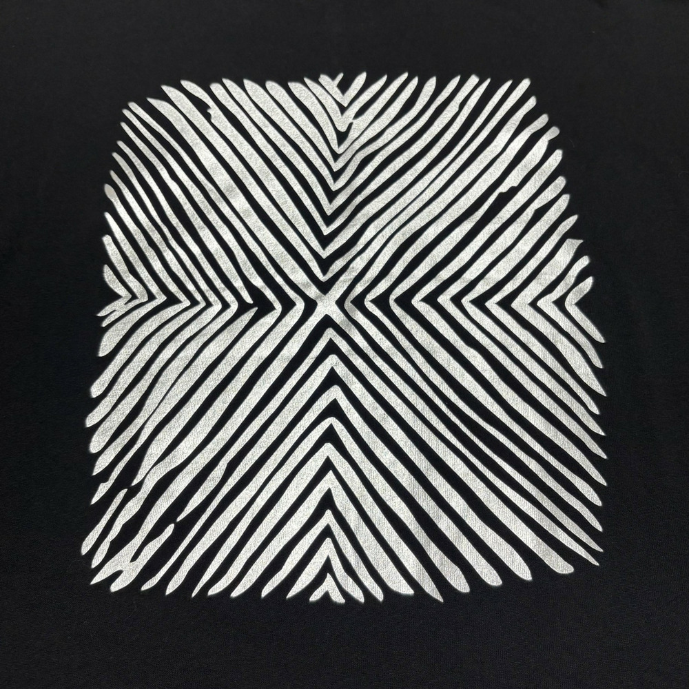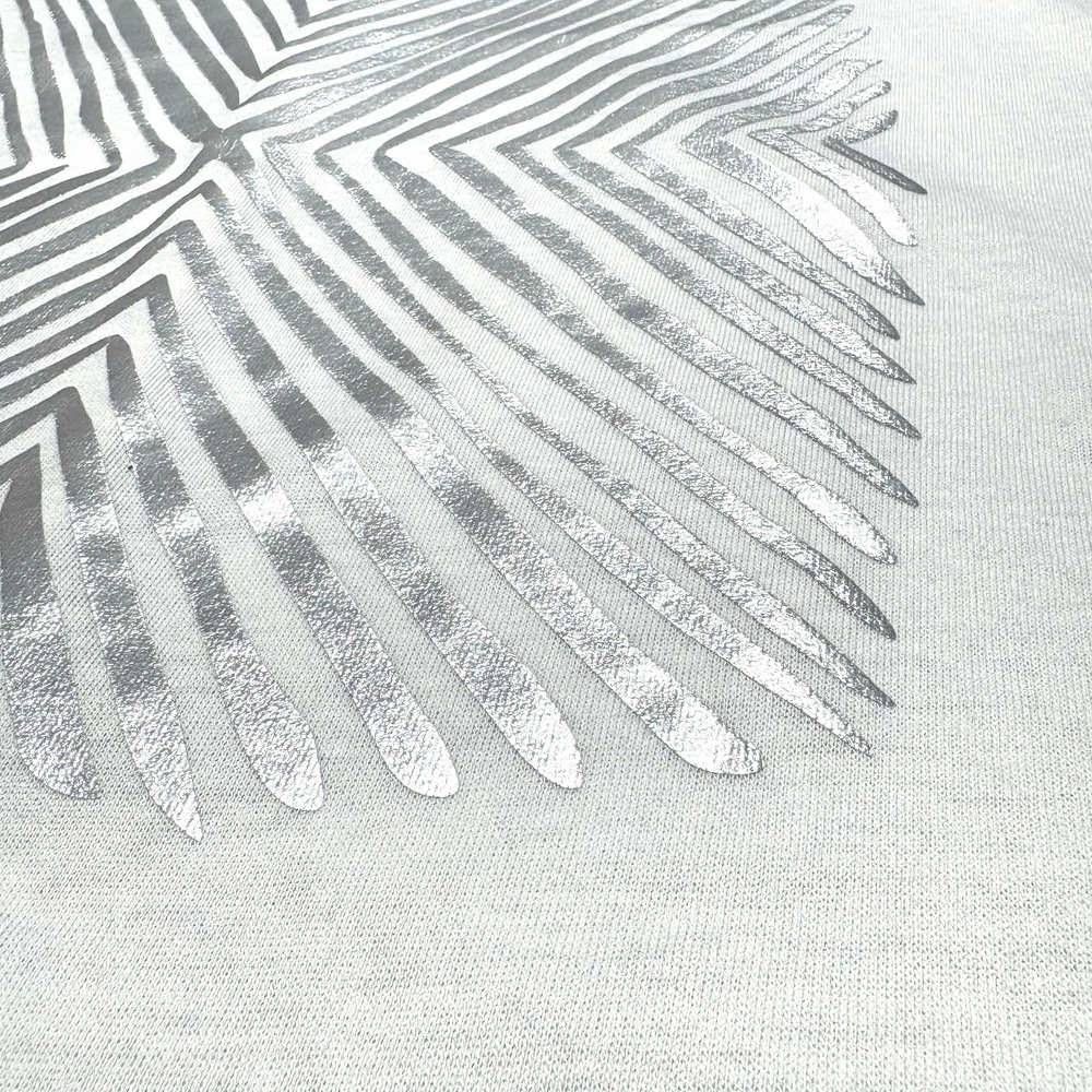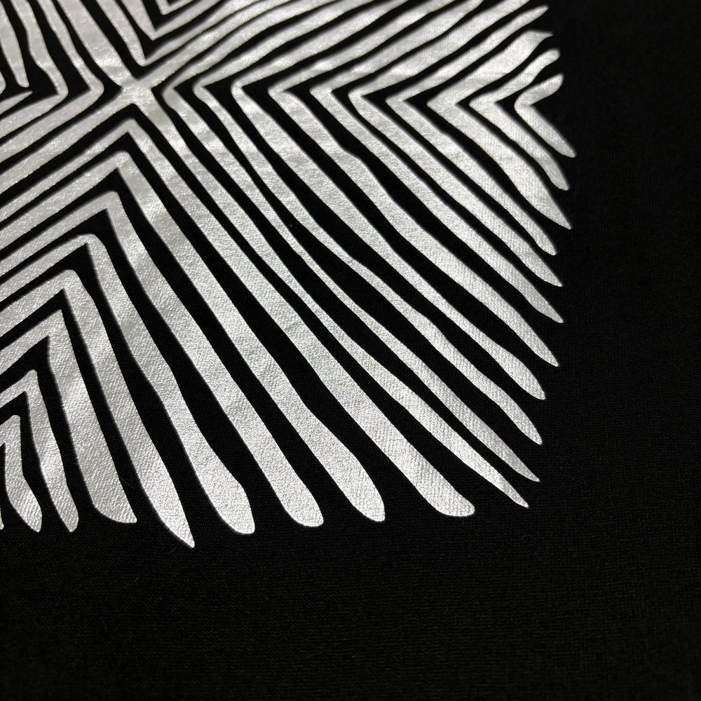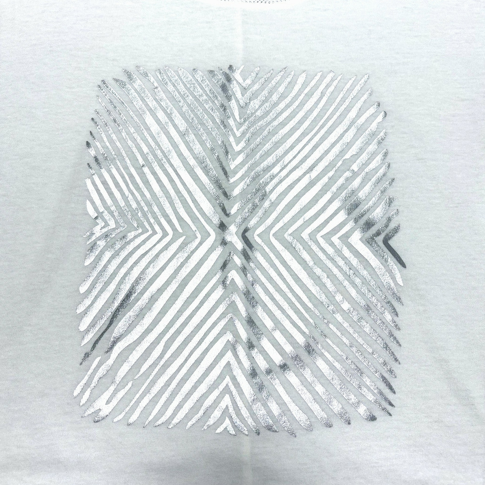 フロントにはシャイニーな箔プリントと幾何学模様を施し、シンプルな中に存在感をプラスした一枚です。