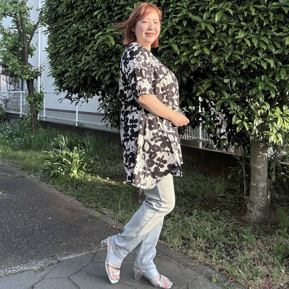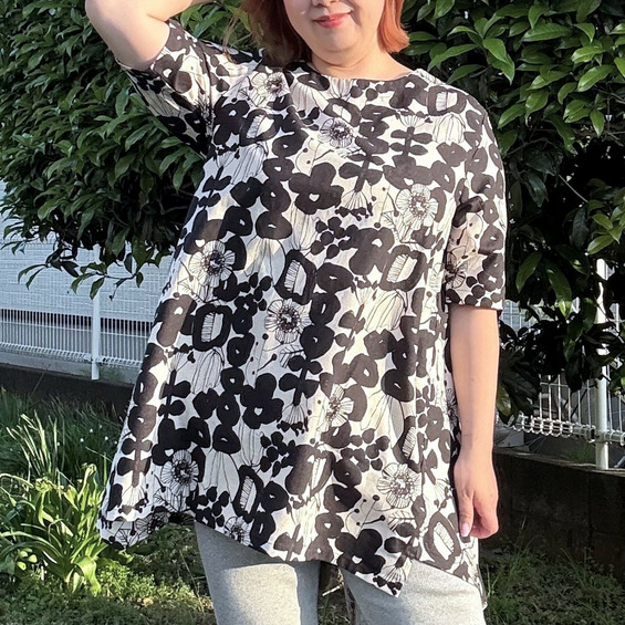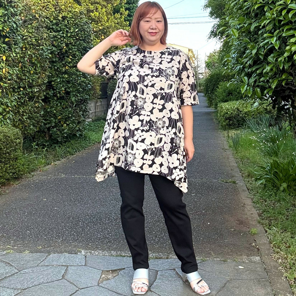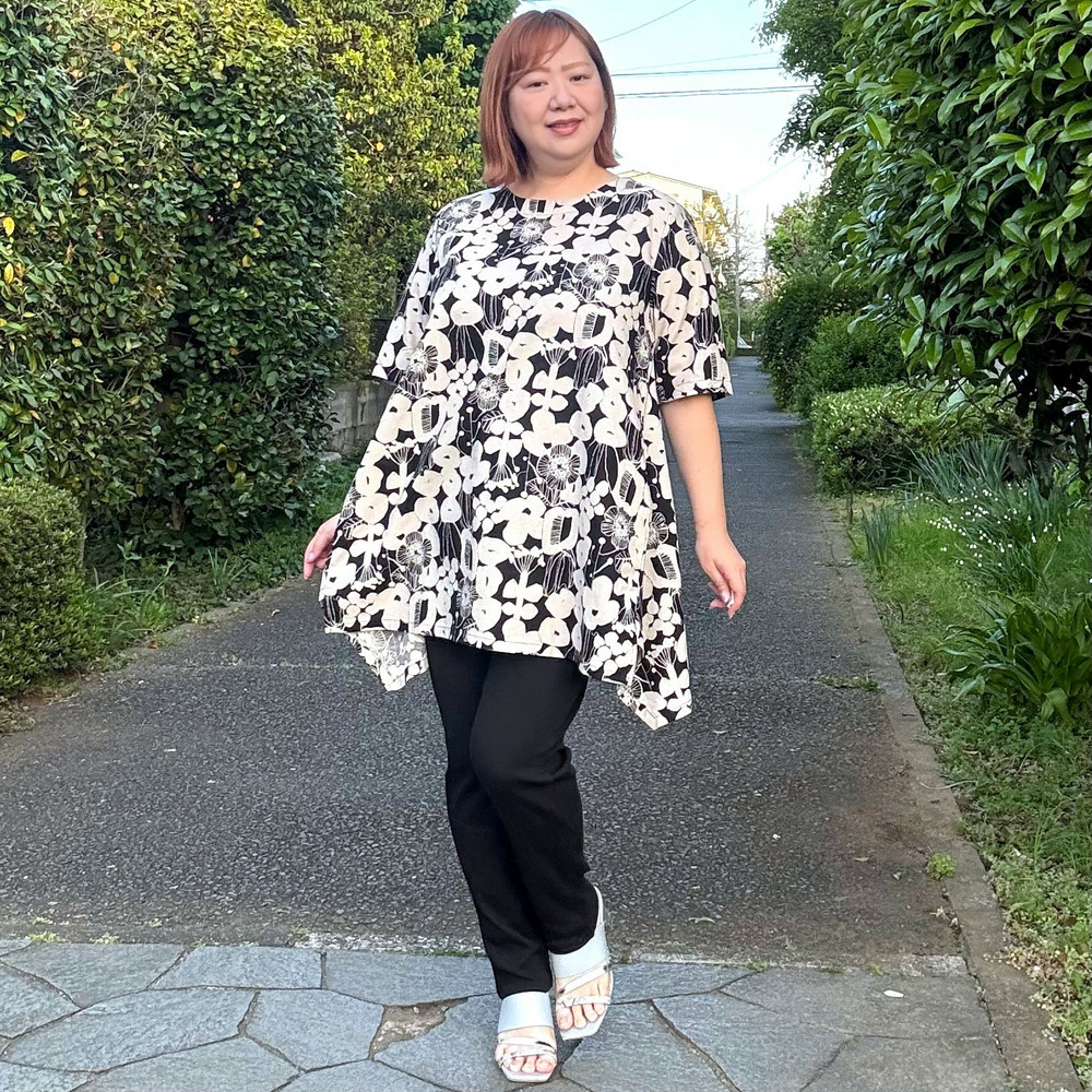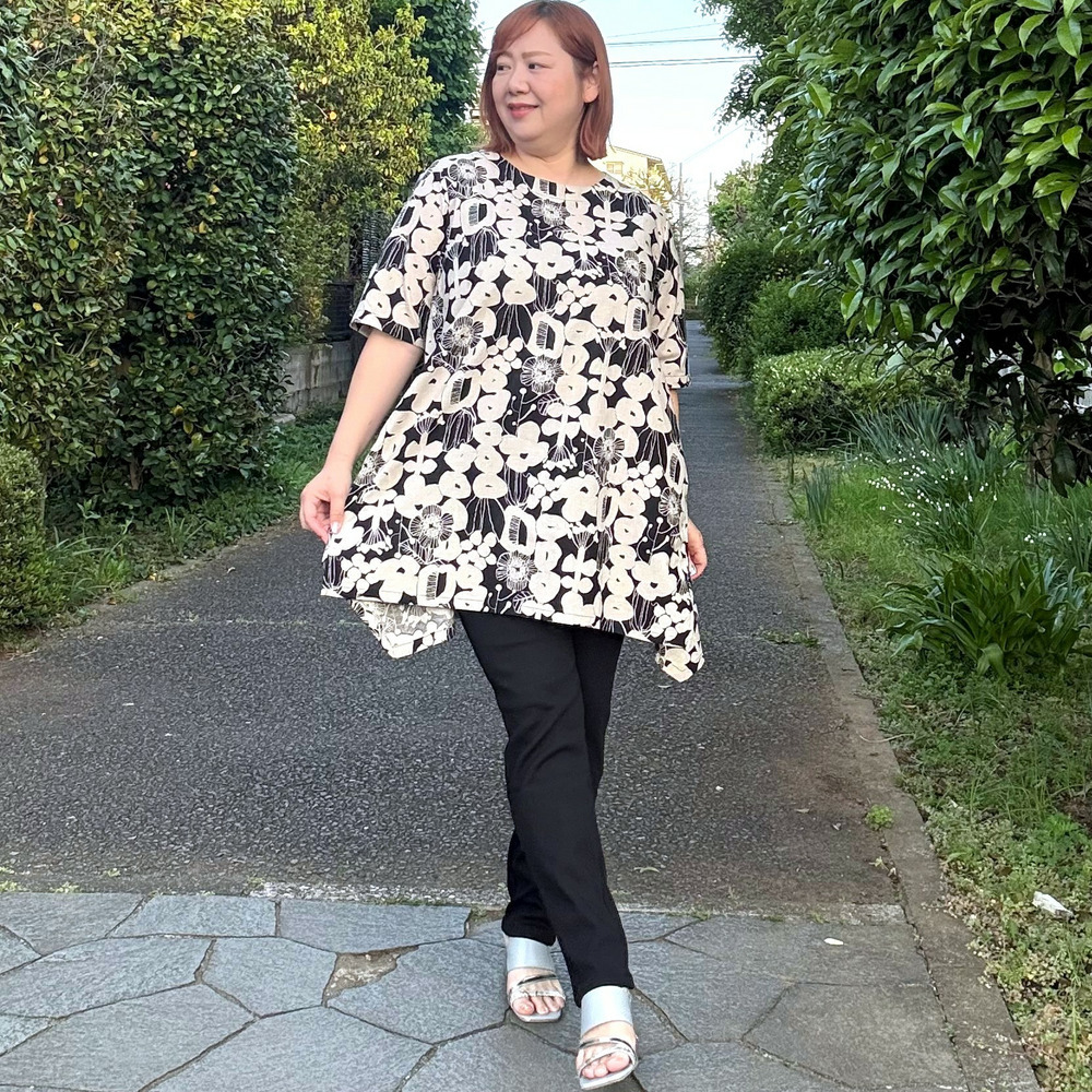 大胆なフラワーモチーフをモノトーンやシックなカラーで表現した、アート感あふれるチュニック。
