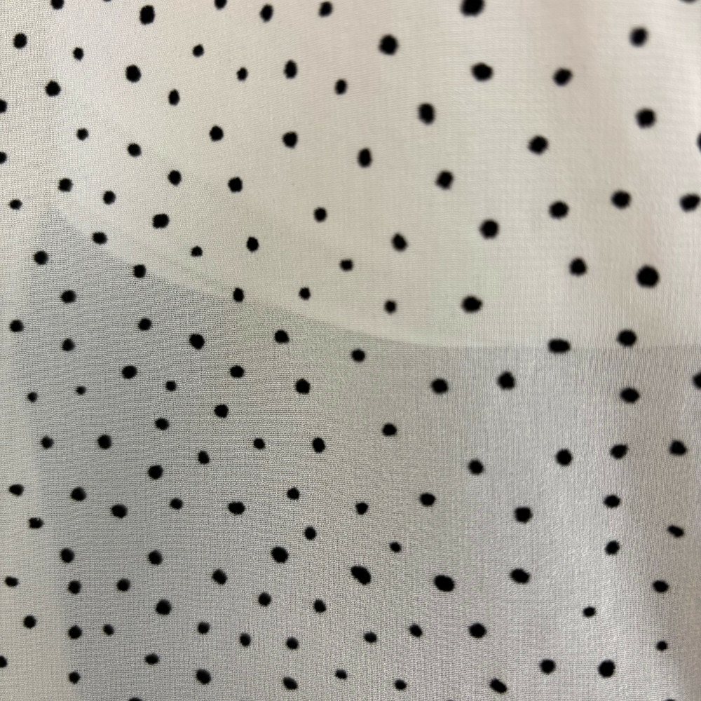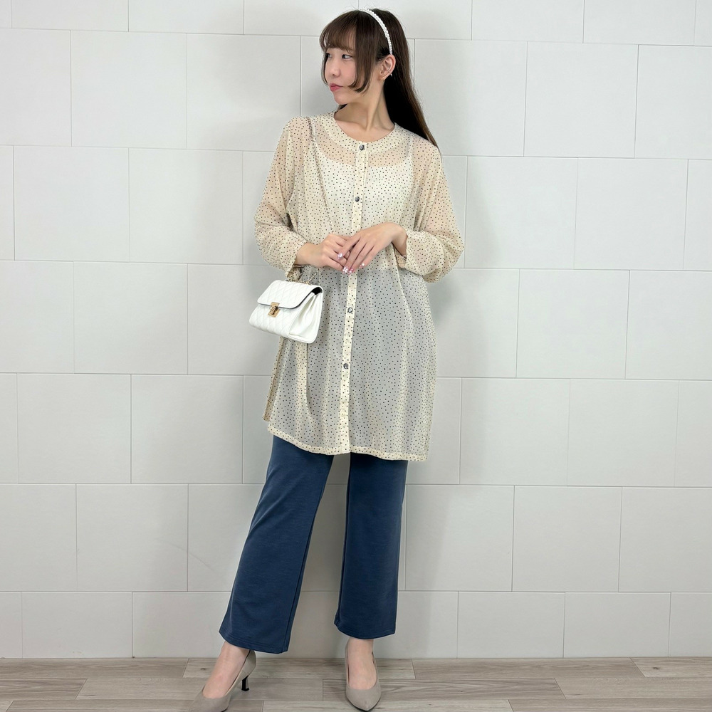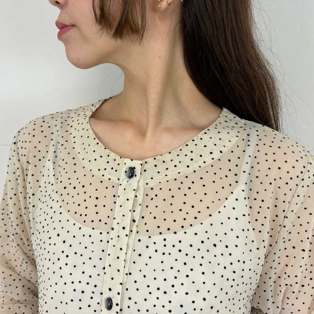 全体にあしらわれた小さめのフロッキードット柄が、可愛らしさを添えながらも甘くなりすぎず、優しい雰囲気を演出。