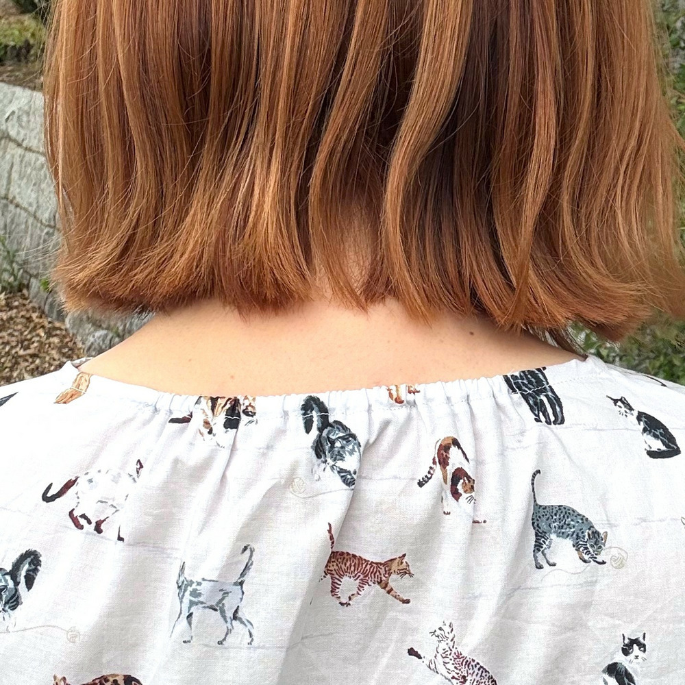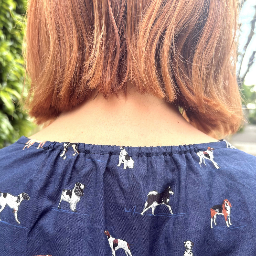 後ろネックはゴムギャザー仕様で、かぶるだけで簡単に着脱できるのも嬉しいポイントです。