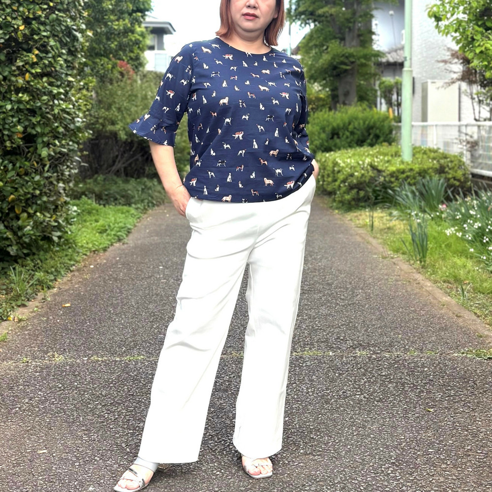 袖はひらりと揺れる切替フレアスリーブで、気になる二の腕をカバーしつつ、華やかさと抜け感をプラス。