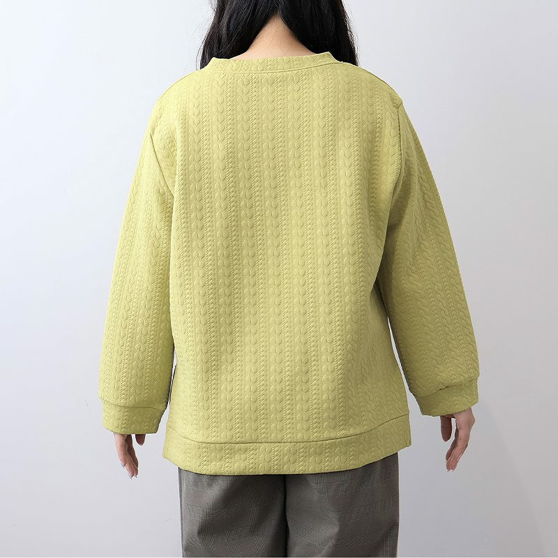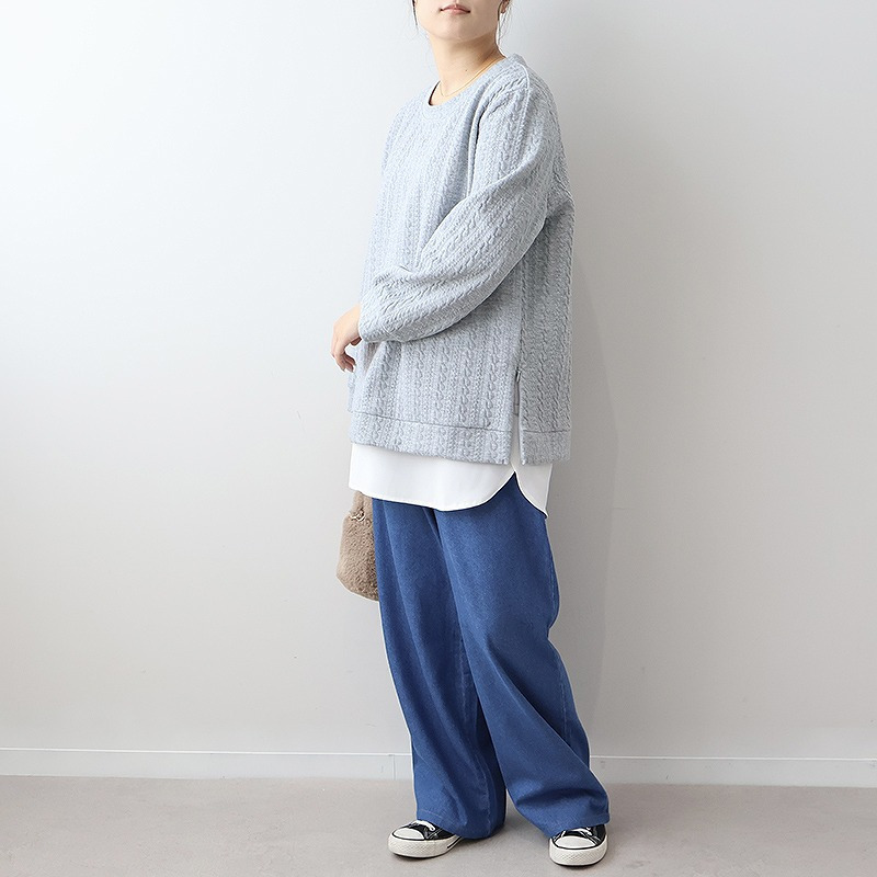 ケーブル柄を引き立たせてくれるシンプルなクルーネックのデザイン。