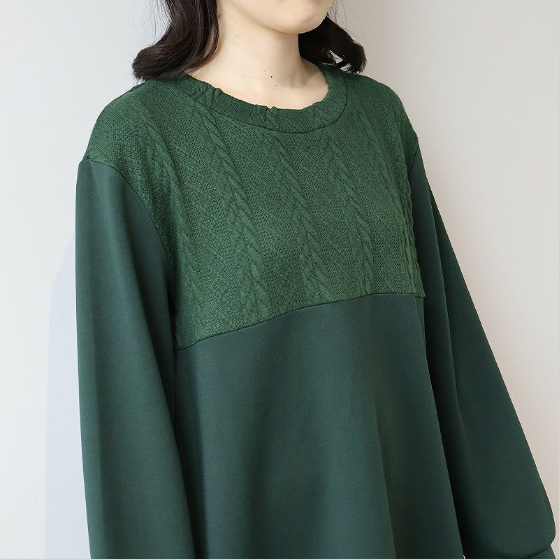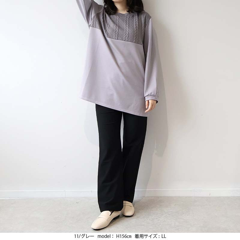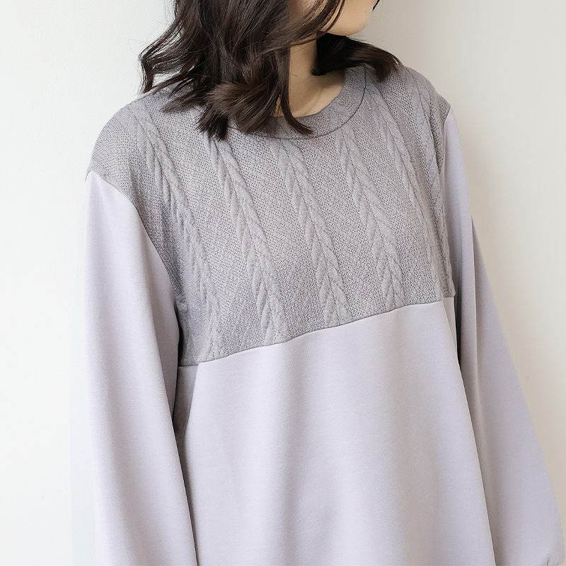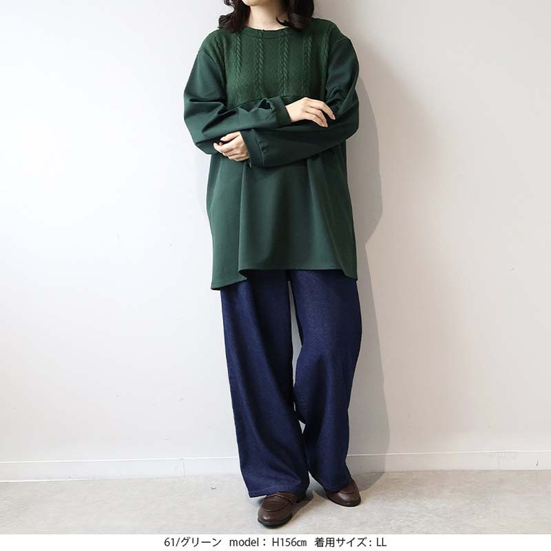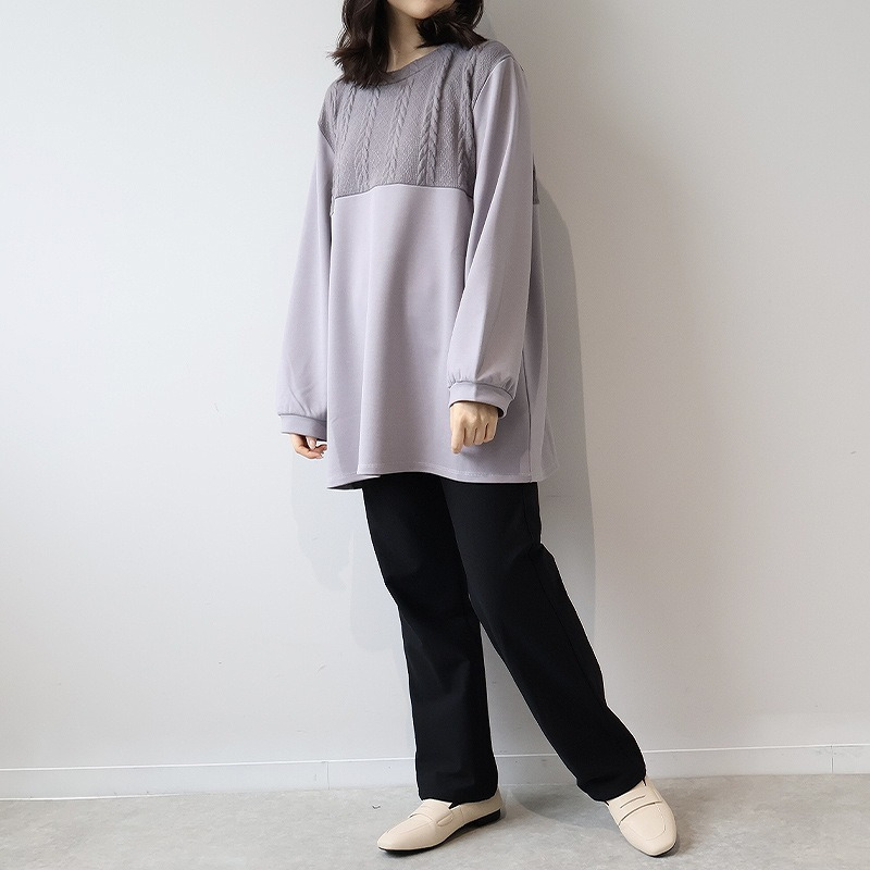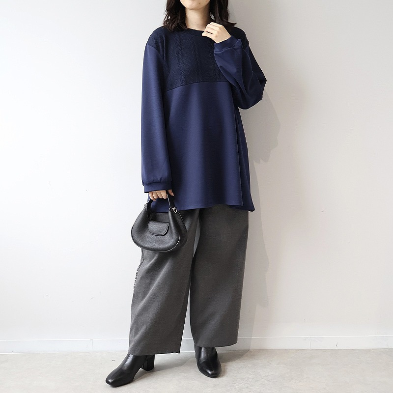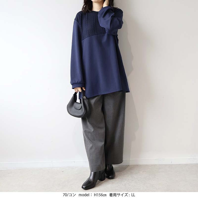 胸元に施された同色のポンチ素材とケーブル編みニットの切り替えが上品な立体感を出し、縦ラインを強調することでスッキリ見え。