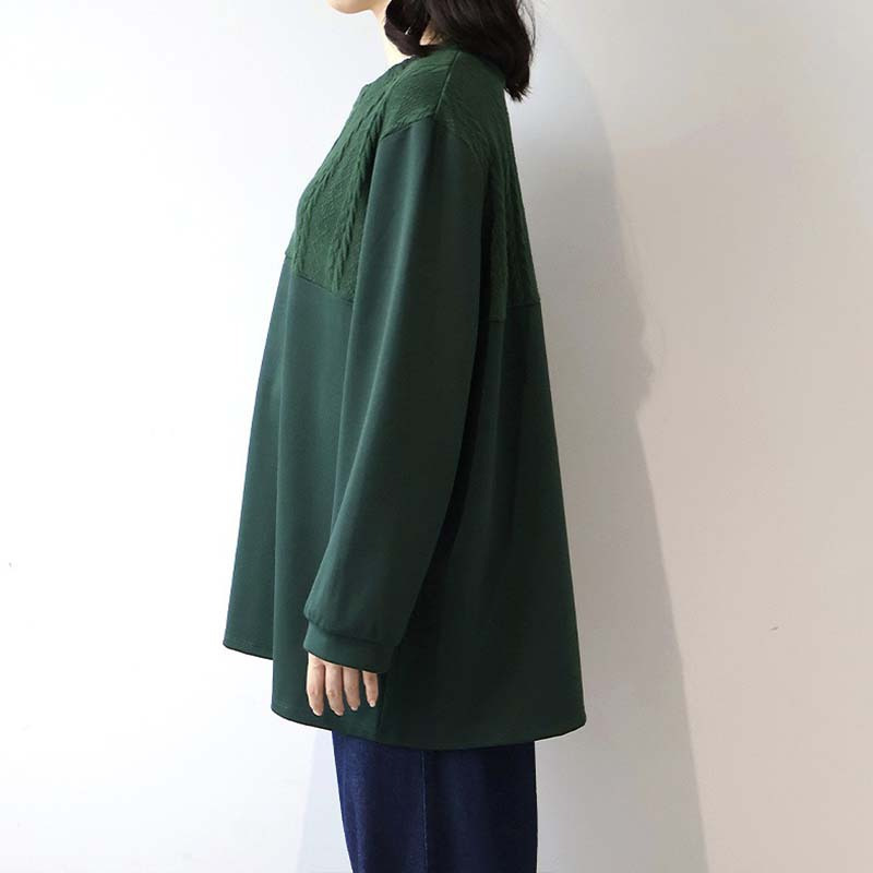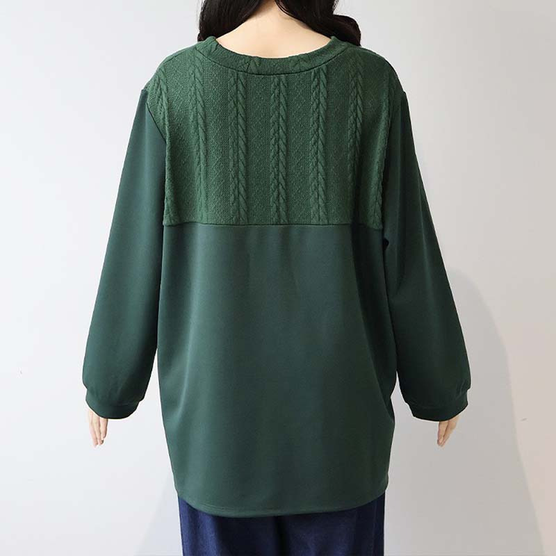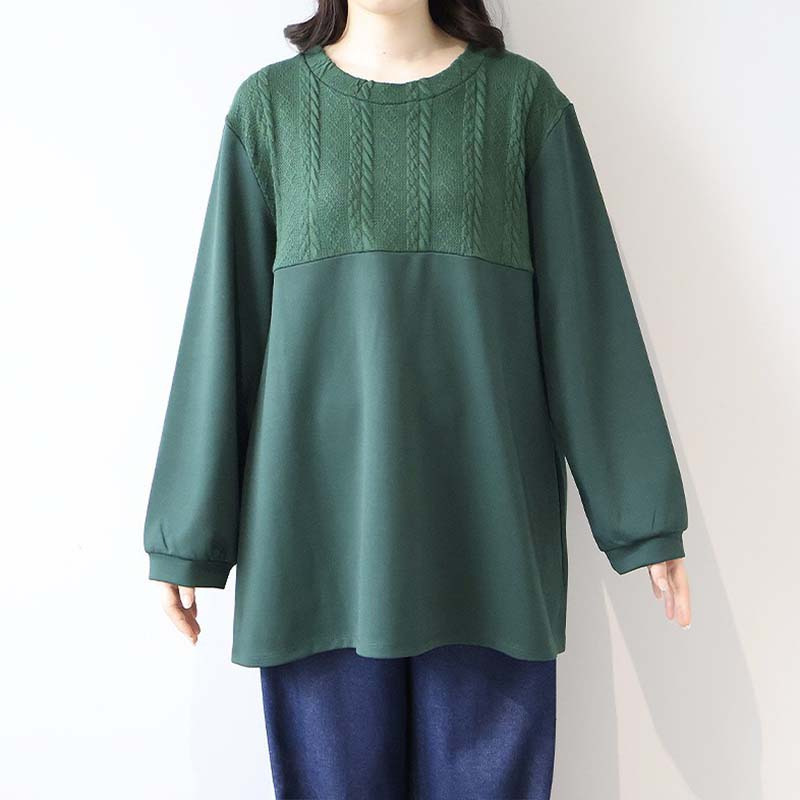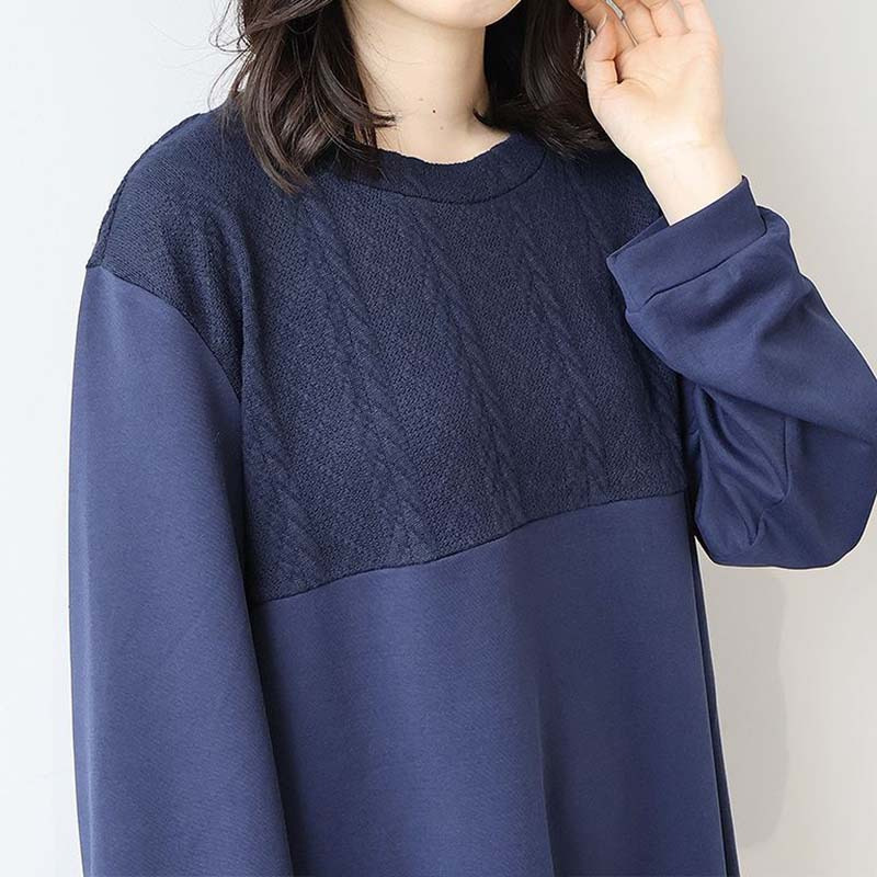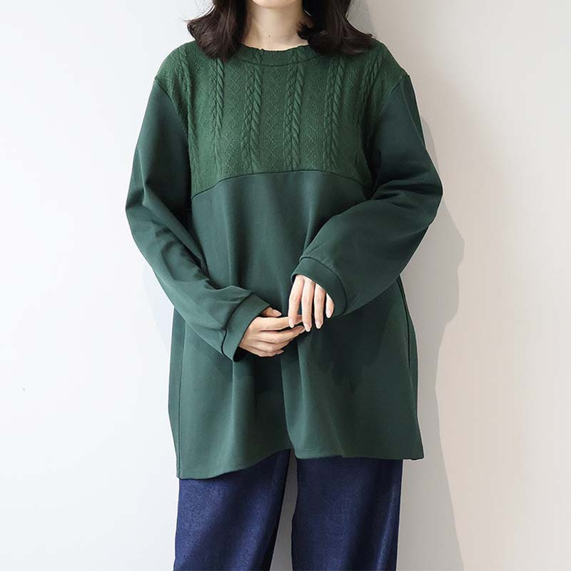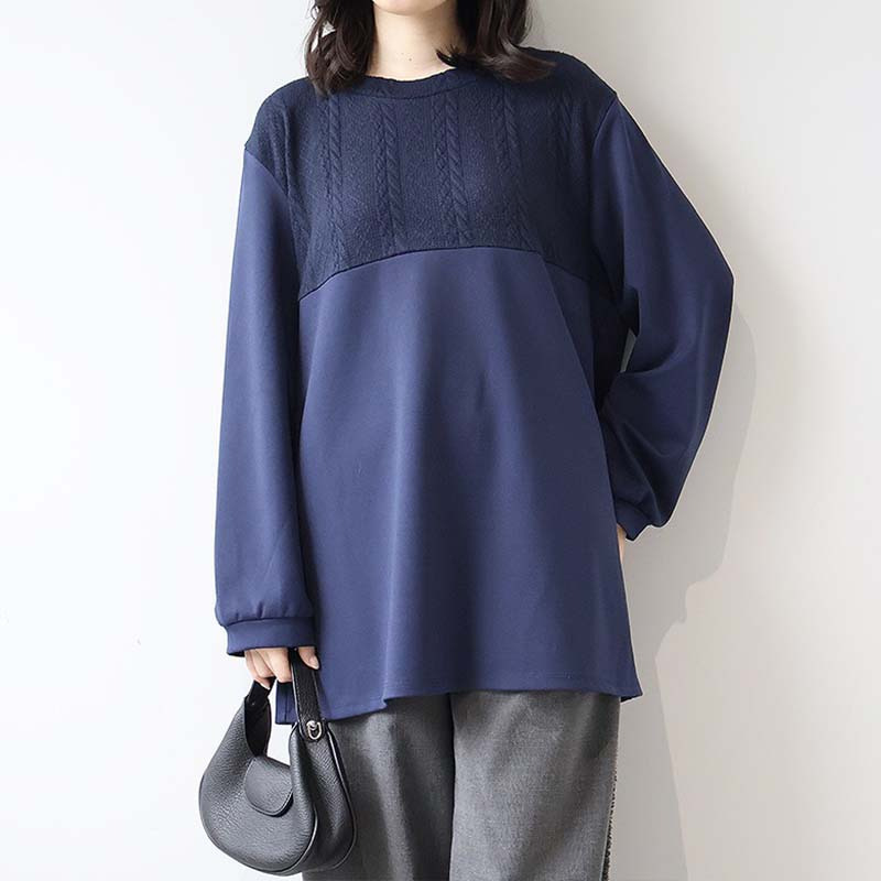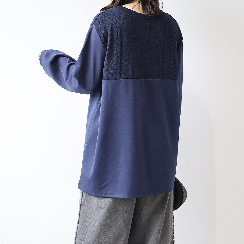 胸元に施された同色のポンチ素材とケーブル編みニットの切り替えが上品な立体感を出し、縦ラインを強調することでスッキリ見え。