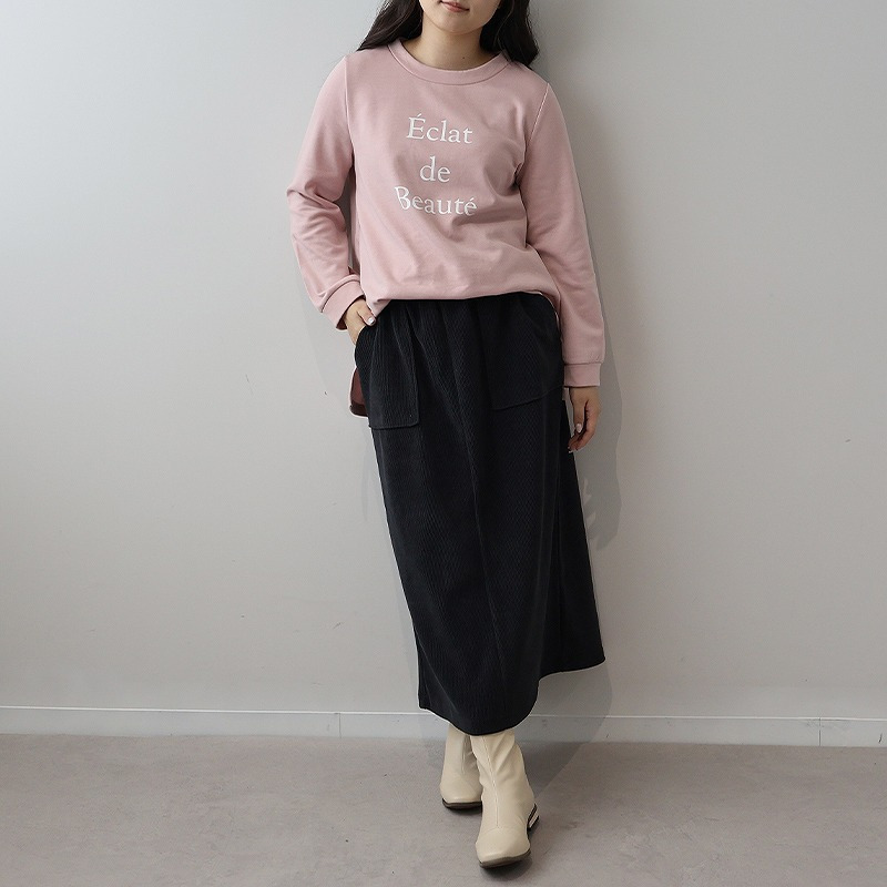 フロントにあしらった大きめのポケットが、気になるお腹周りをさりげなくカバーしてくれます。