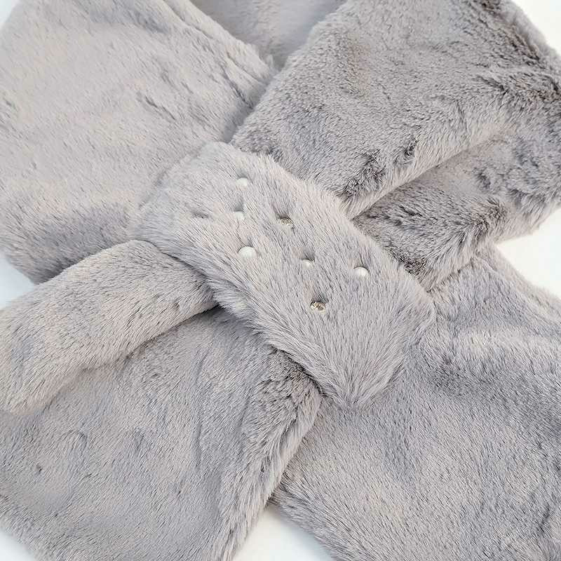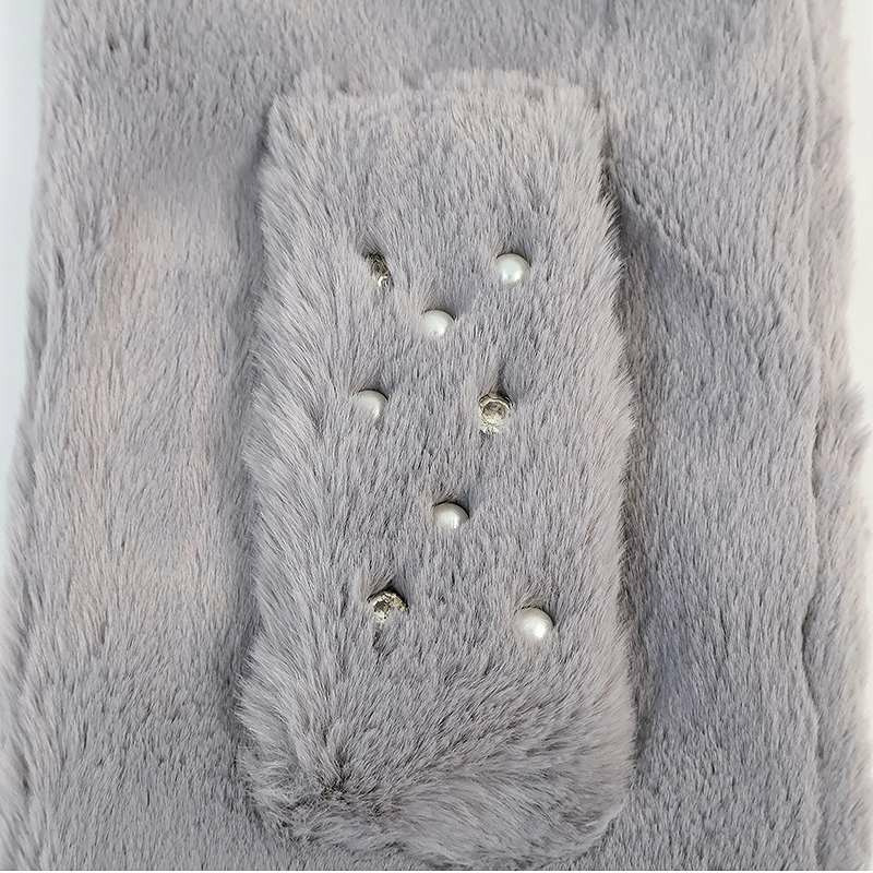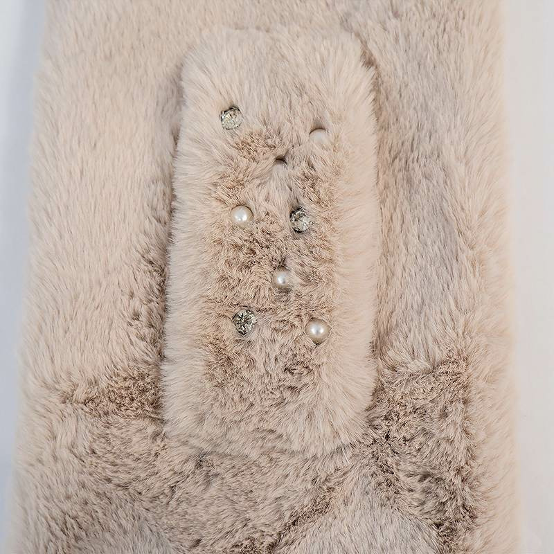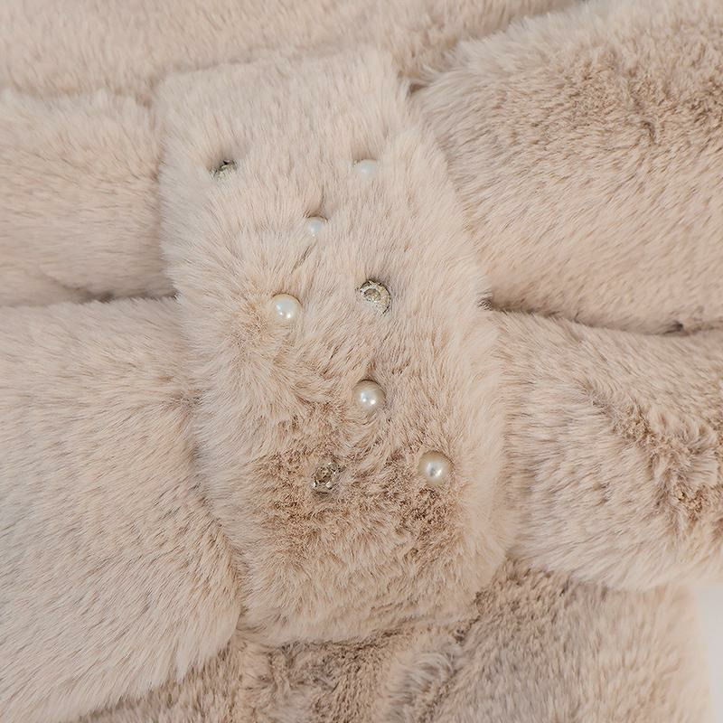 差し込みループにあしらわれた、きらめくビジューと上品なパールがアクセントになったエコファーティペット。