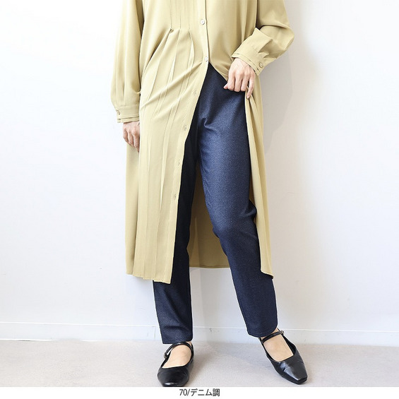 脚のラインに程よくフィットし、肉感を拾いすぎない絶妙なシルエットで、重ね着してもすっきりと見せてくれます。