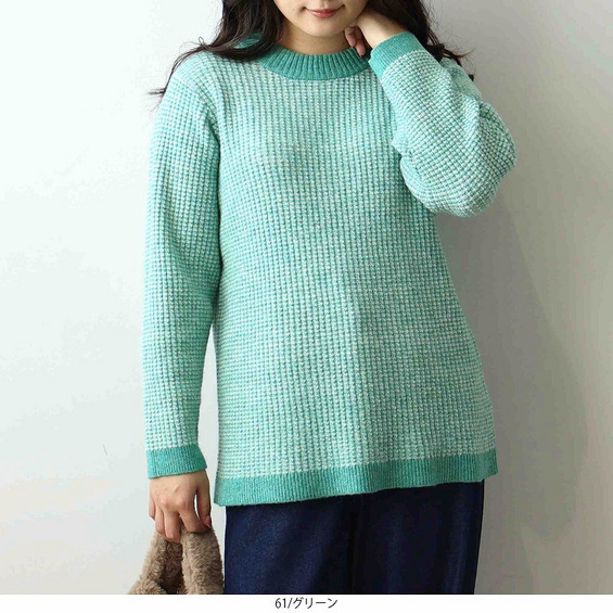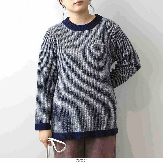 身頃に施されたタック編みが縦のラインをさりげなく作り出し、のっぺり見えを防ぎます。