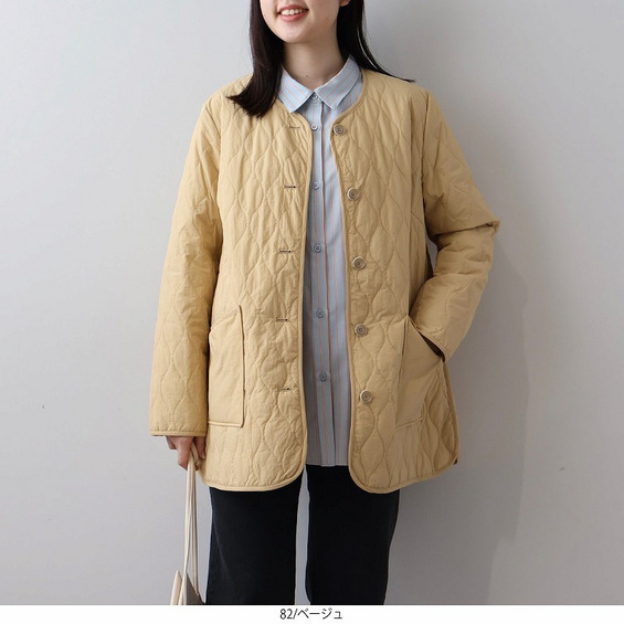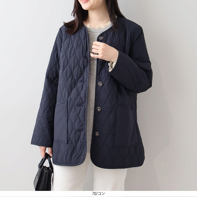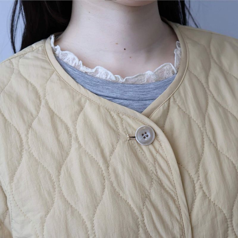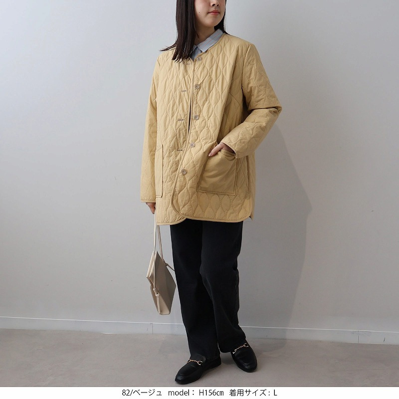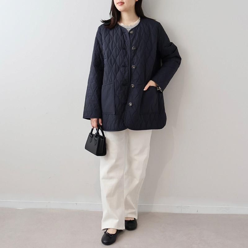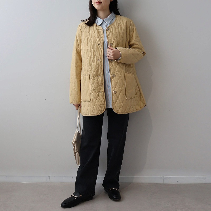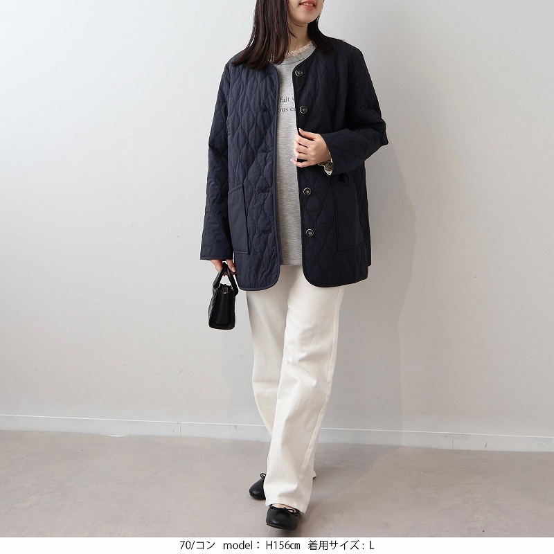 中綿には薄手で柔らかなタイプを選んでいるため、キルティングアウター特有の着膨れ感がなく、すっきりと着こなせます。