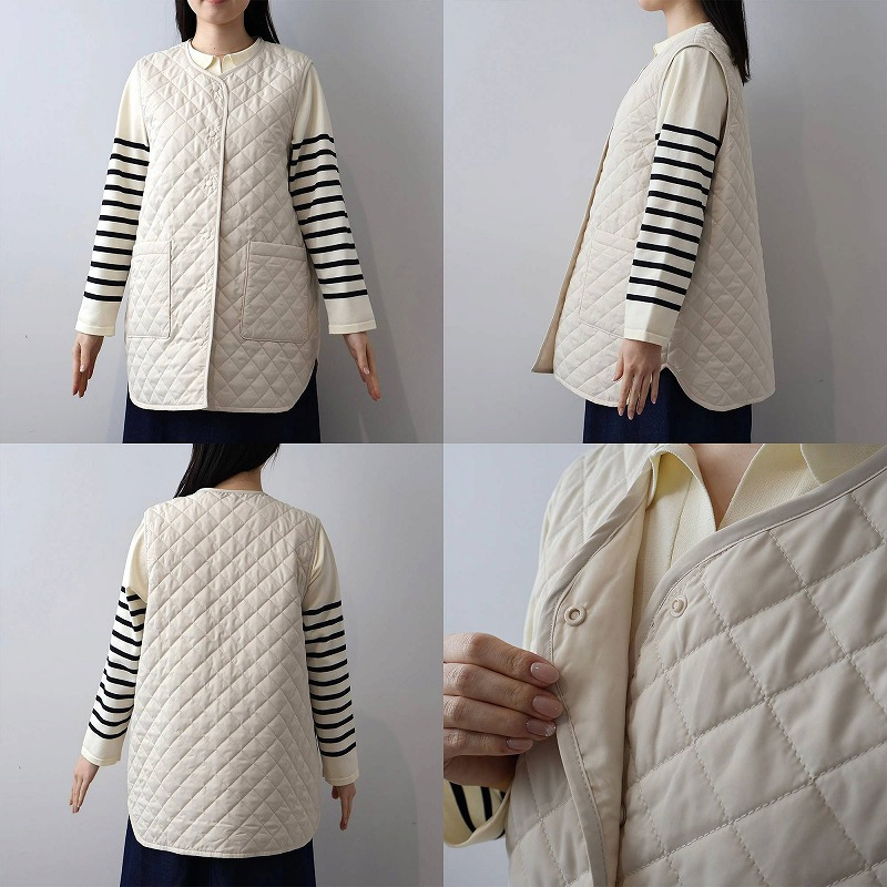 小さめのダイヤ柄キルトなので、着膨れせずすっきりと着こなせます。