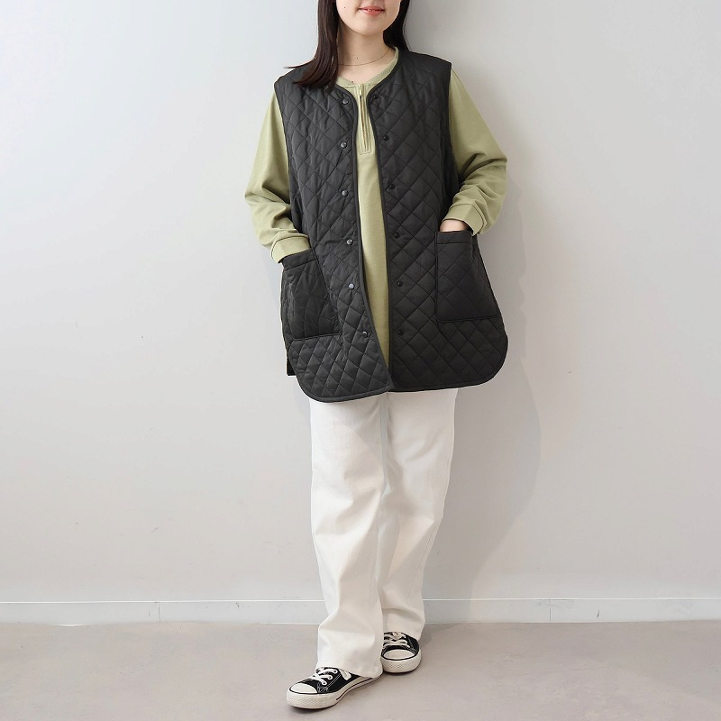 ベストは縦のラインを強調し、すっきりと見せてくれるロング丈。ヒップ周りを自然にカバーし、スタイルアップを後押しします。