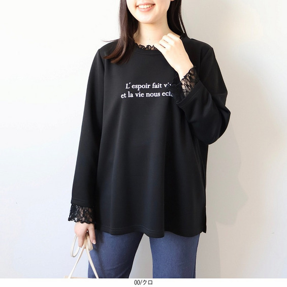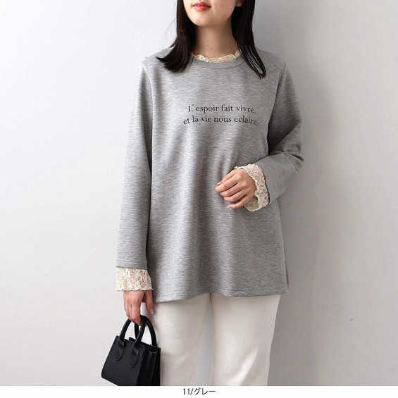 スウェットライクなプルオーバーの衿元と袖口に、繊細なレースをドッキングしました。