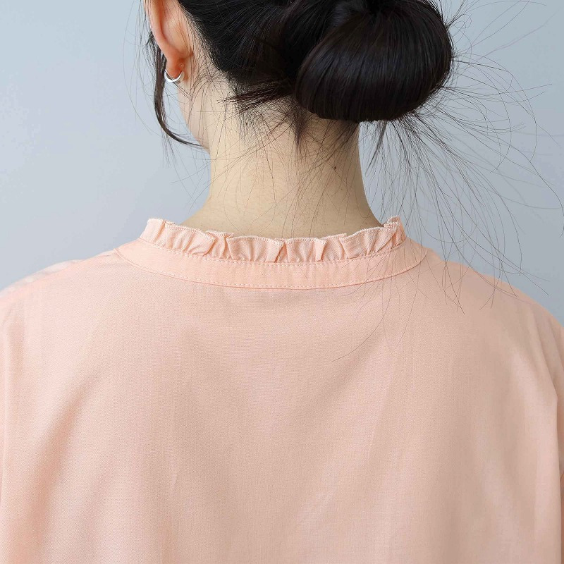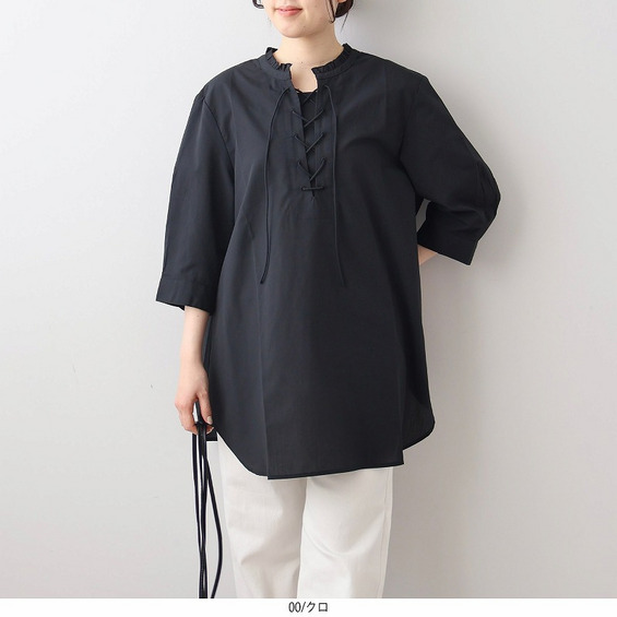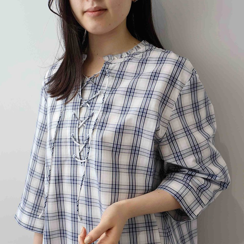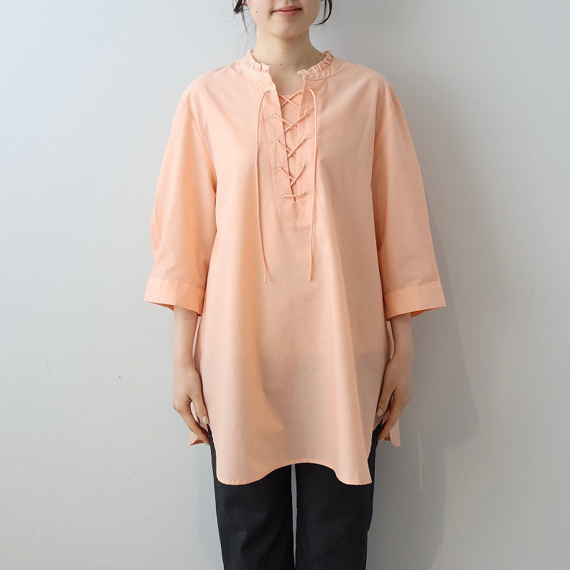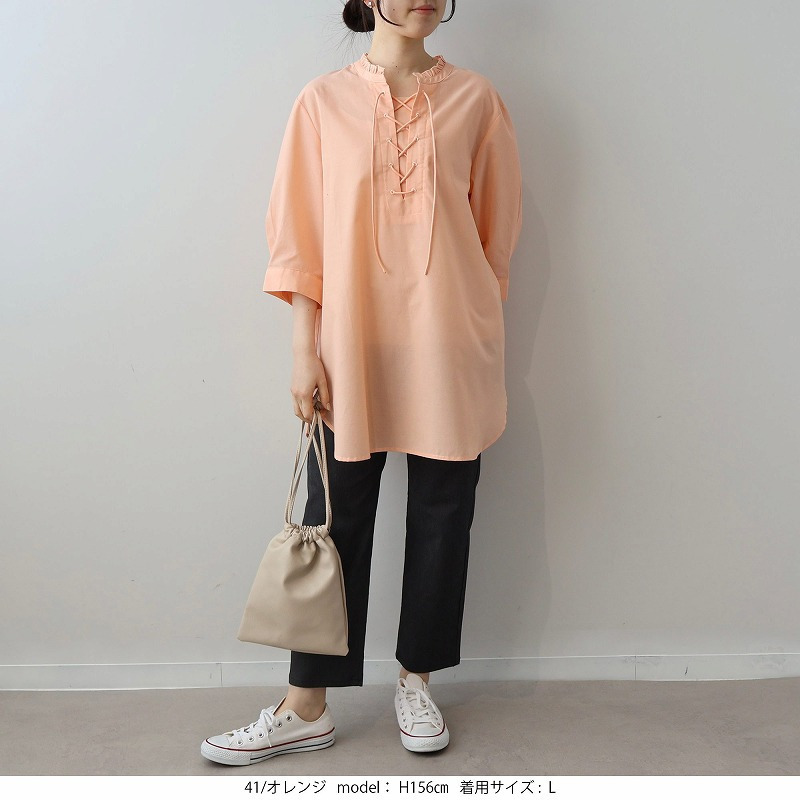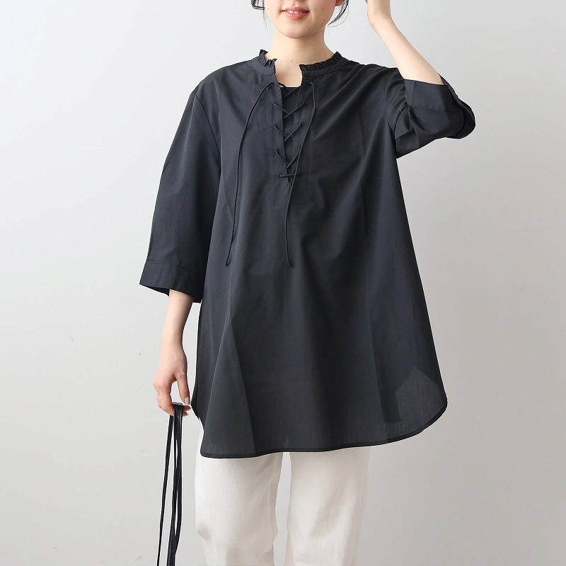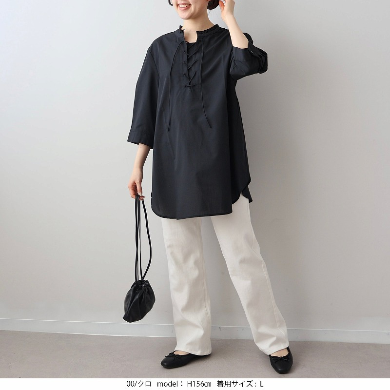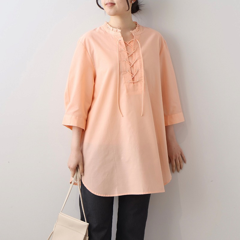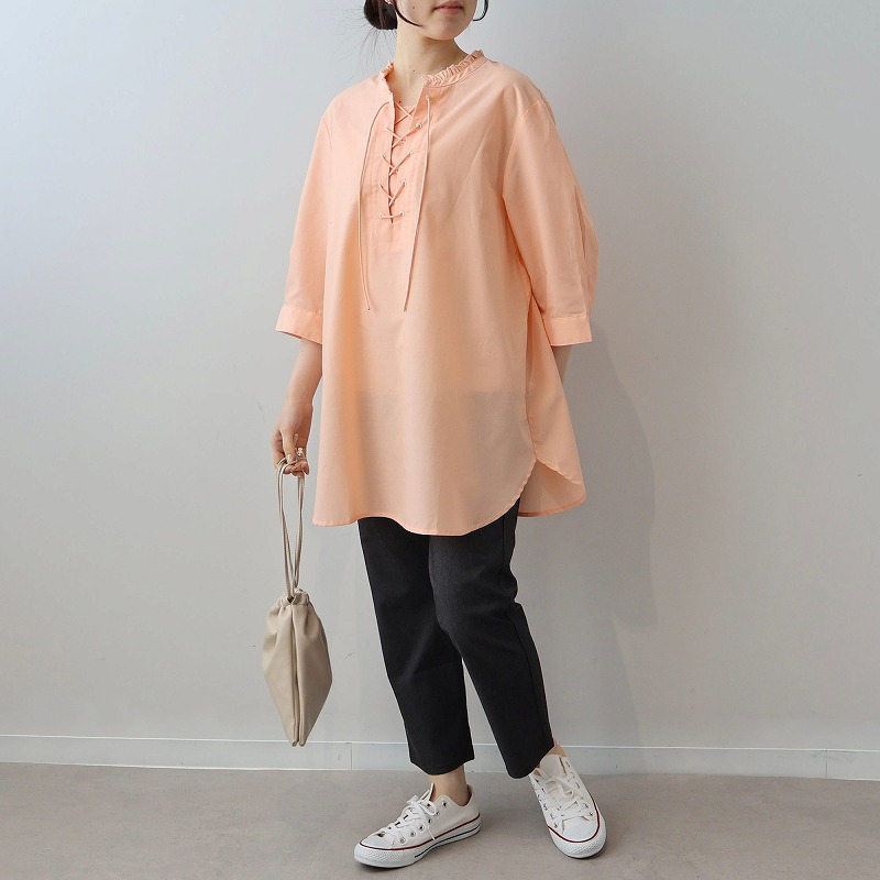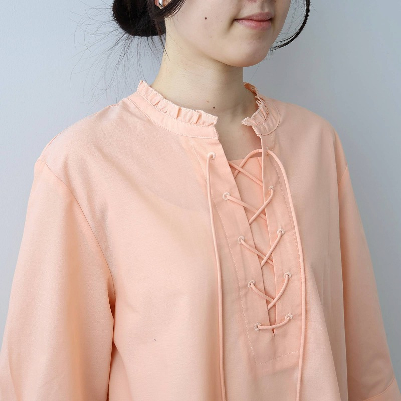 顔周りを上品に彩るチビフリルと、程よい抜け感を演出するレースアップデザインが、甘すぎない大人の可愛らしさを引き立てます。