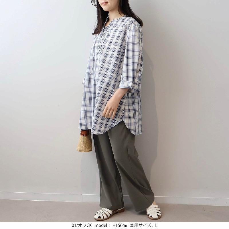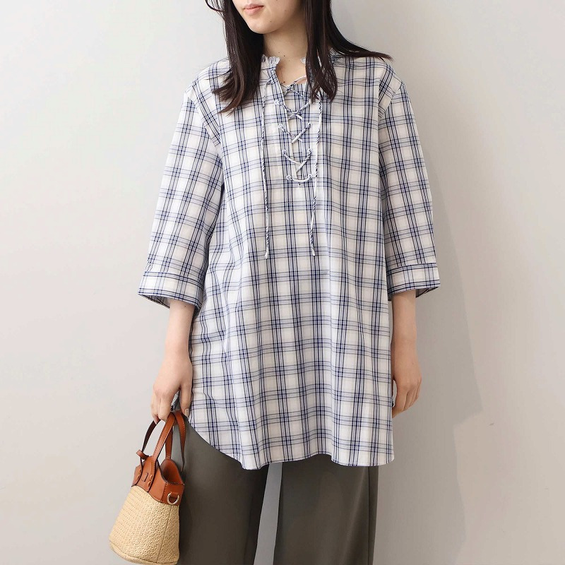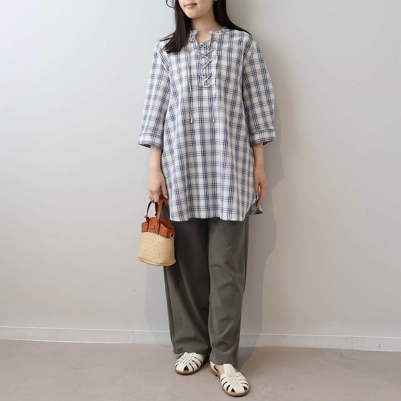 細身のパンツやテーパードパンツと合わせれば、チュニックのふわりとしたシルエットが引き立ち、メリハリのあるすっきりとした着こなしが完成します。