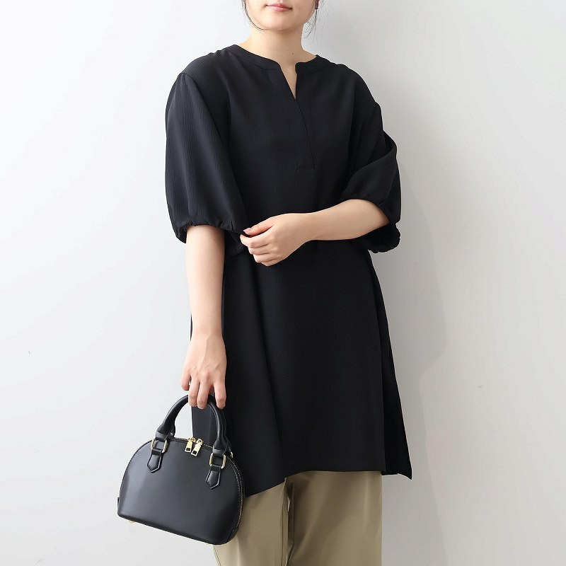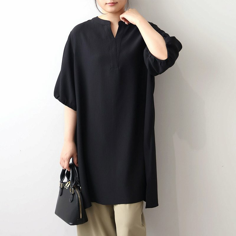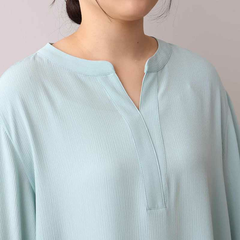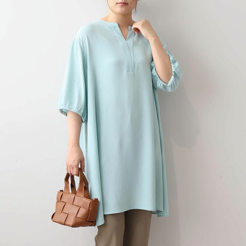 顔周りをすっきりと見せてくれるスキッパーデザインと、袖口にギャザーを寄せたふんわりとした袖が、女性らしい柔らかな印象をプラスします。