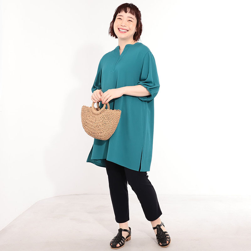 細身のパンツやテーパードパンツと合わせれば、チュニックのAラインシルエットが引き立ち、メリハリのあるすっきりとした着こなしに。
