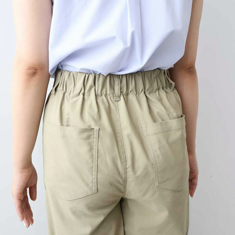 フロントはファスナーのないすっきりとしたデザインですが、後ろは楽ちんゴム仕様。