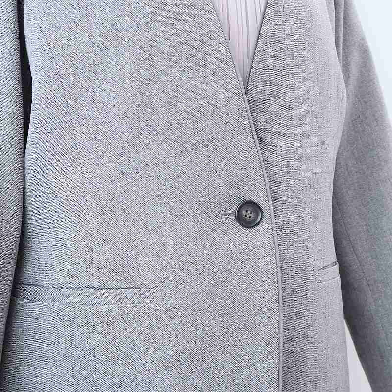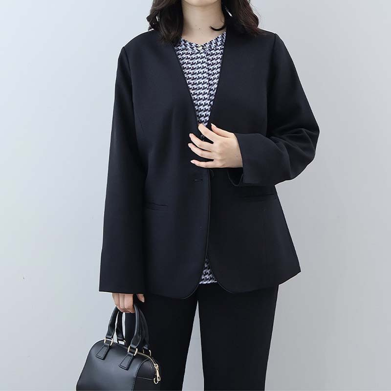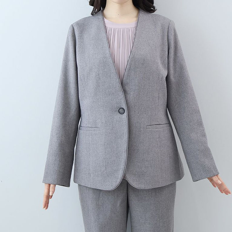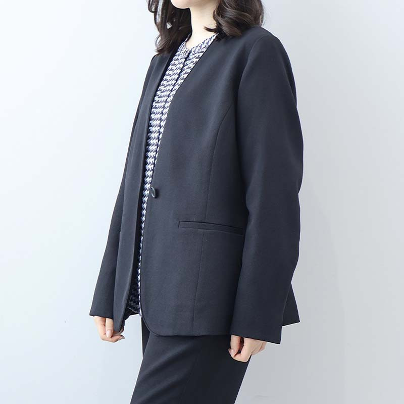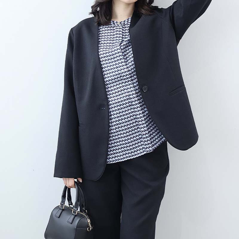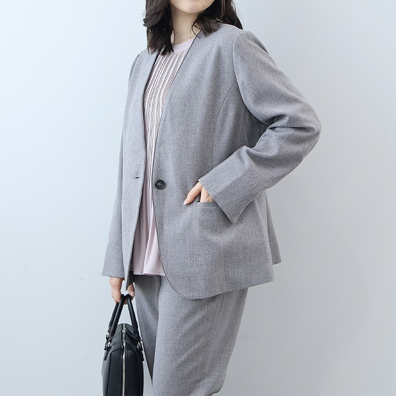 羽織るだけで背筋が伸びるような、大人のための上品なノーカラージャケットです。