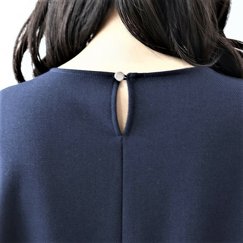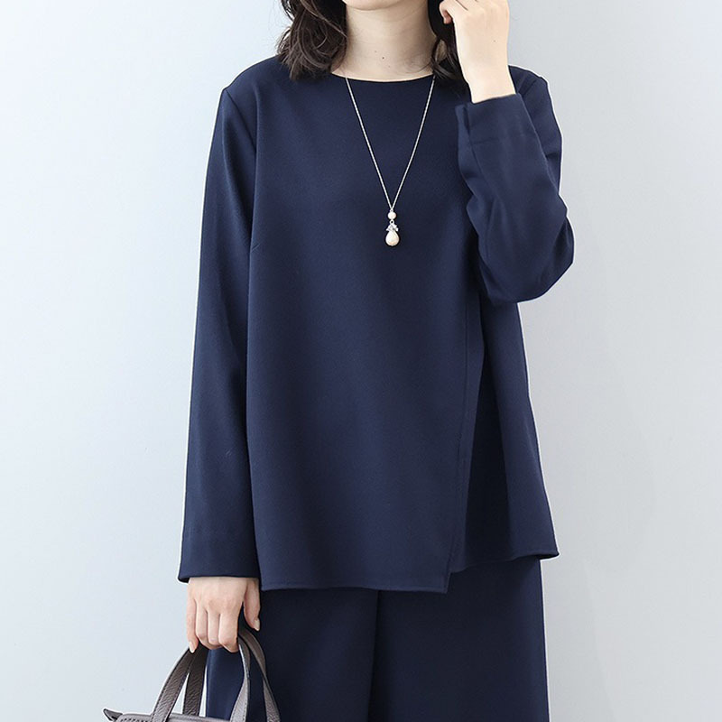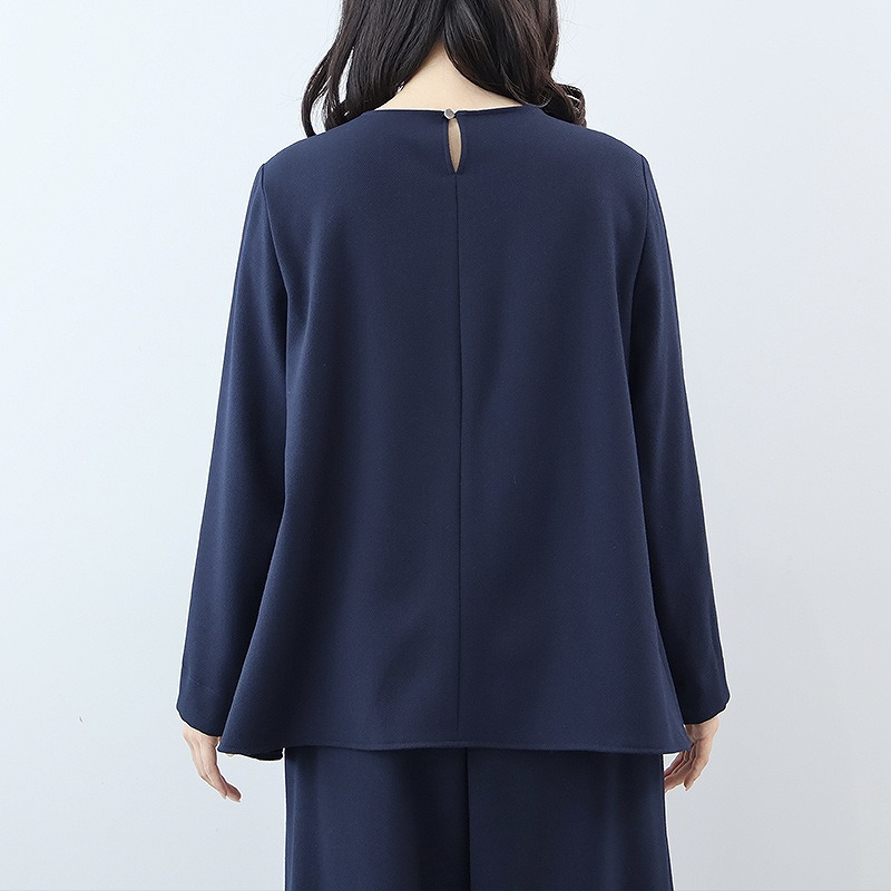 首元は上品なラウンドネック、袖口にはさりげないスリットを施し、1枚で着てもきちんと感のある印象に。