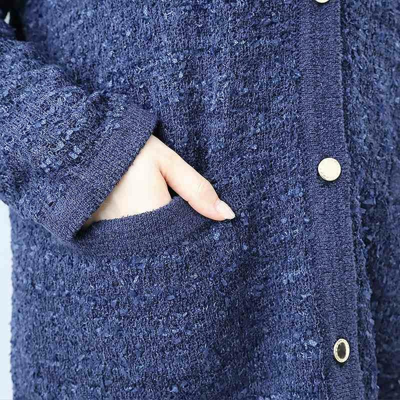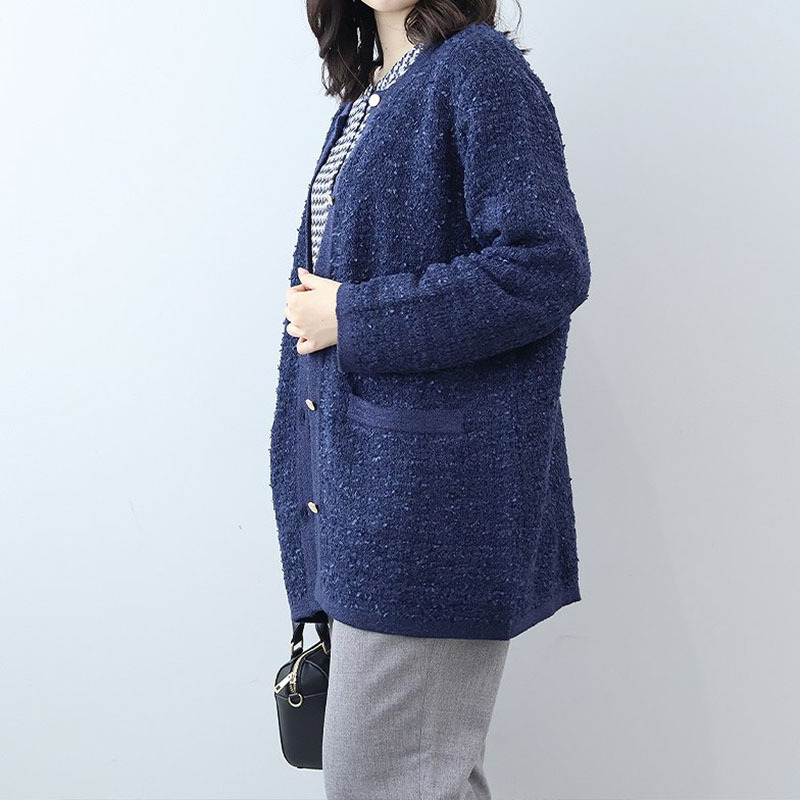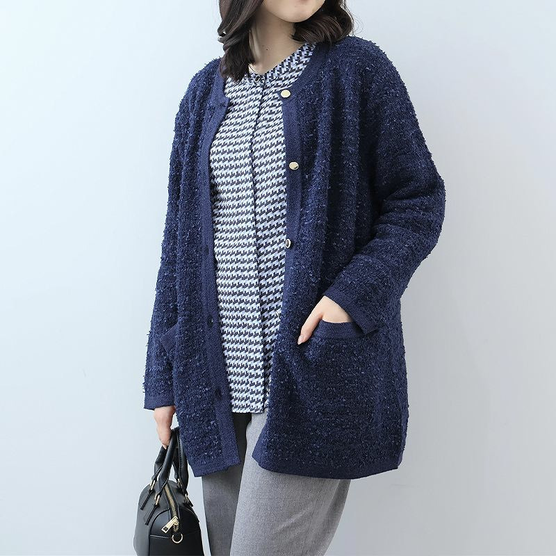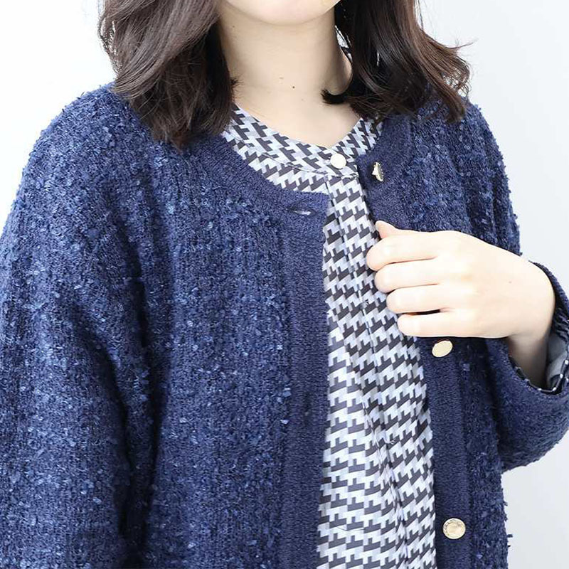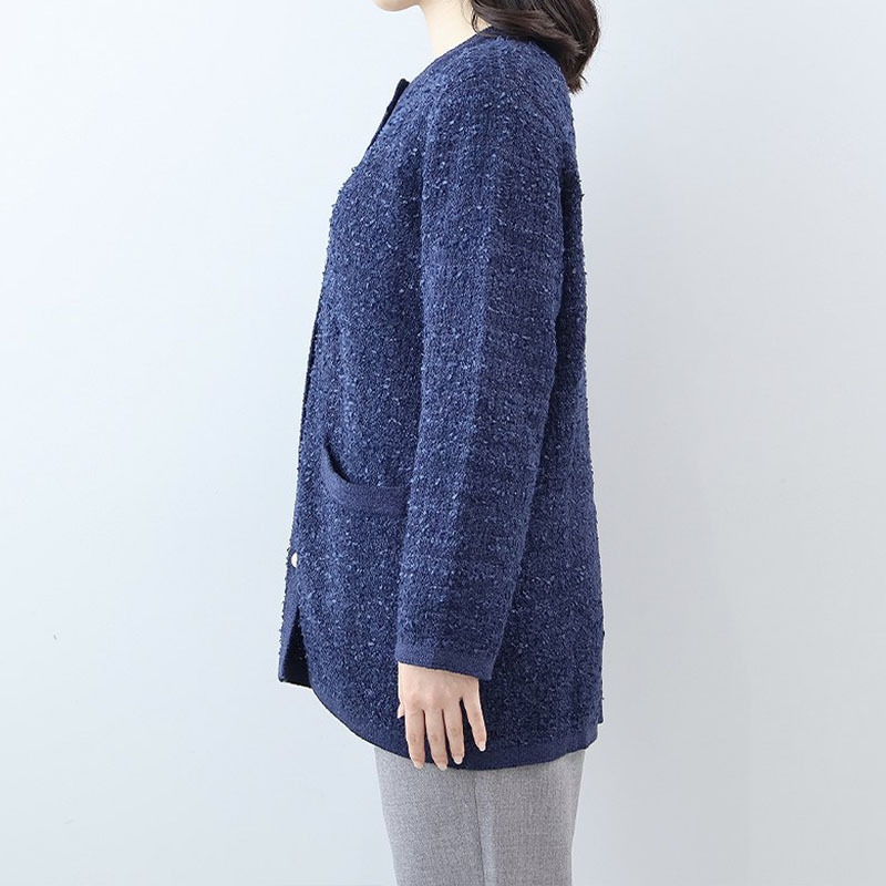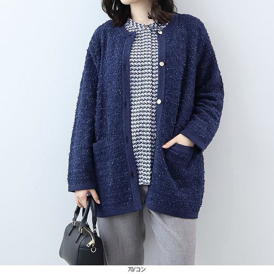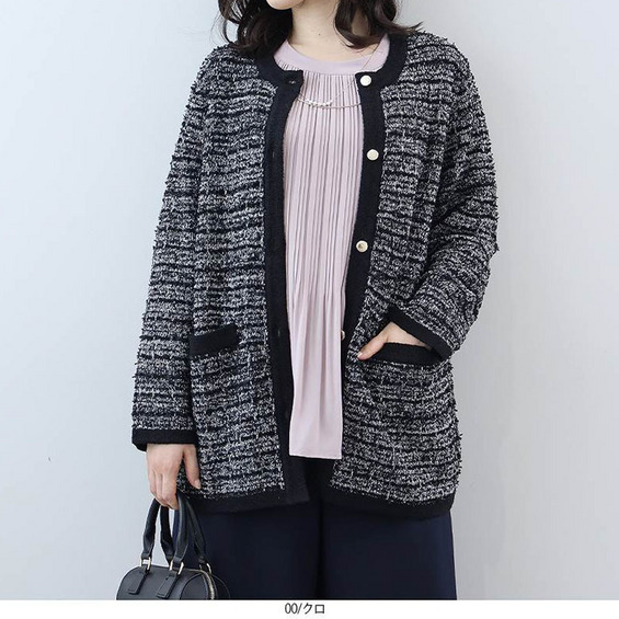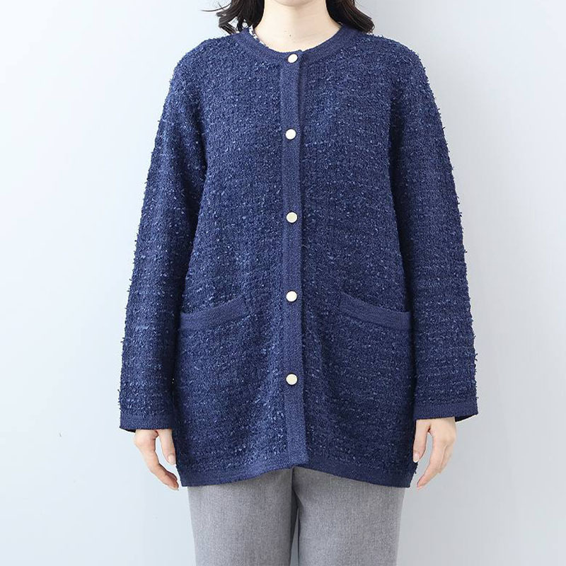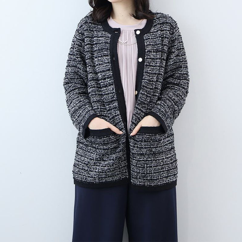 羽織るだけで品格のあるスタイルが完成する、長めの丈のノーカラーカーディガンです。
