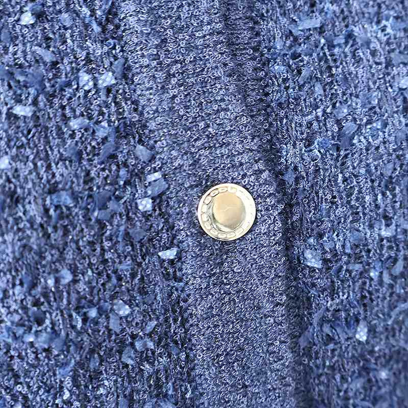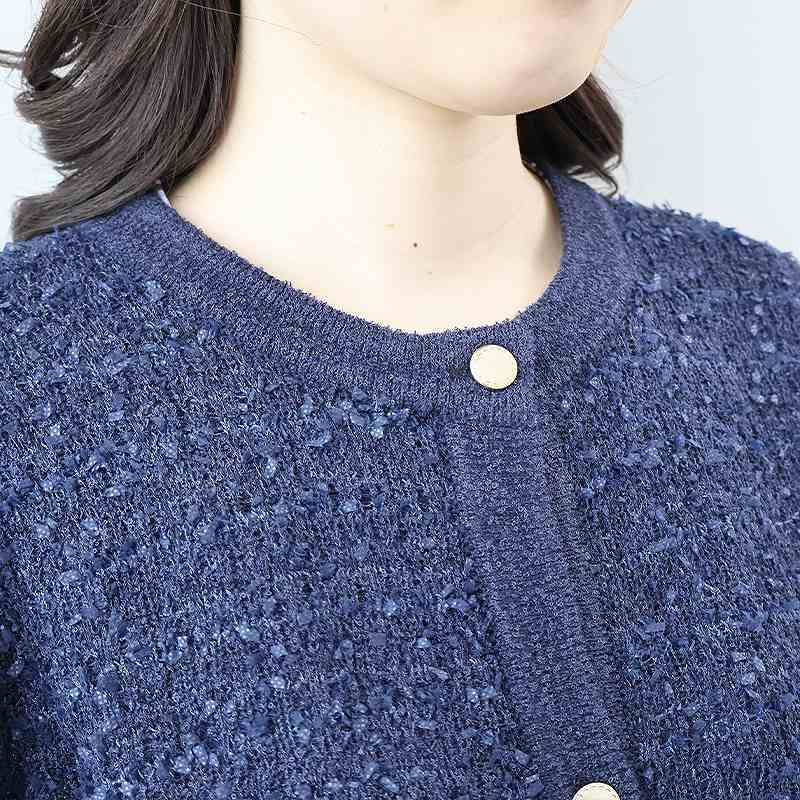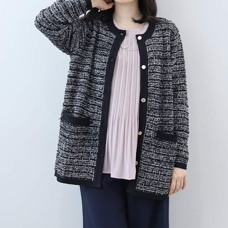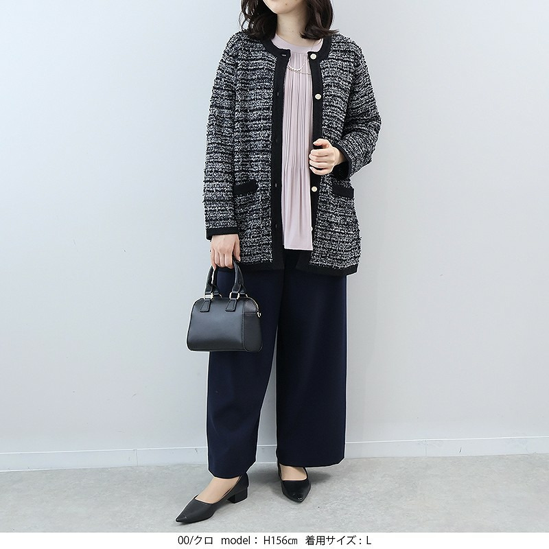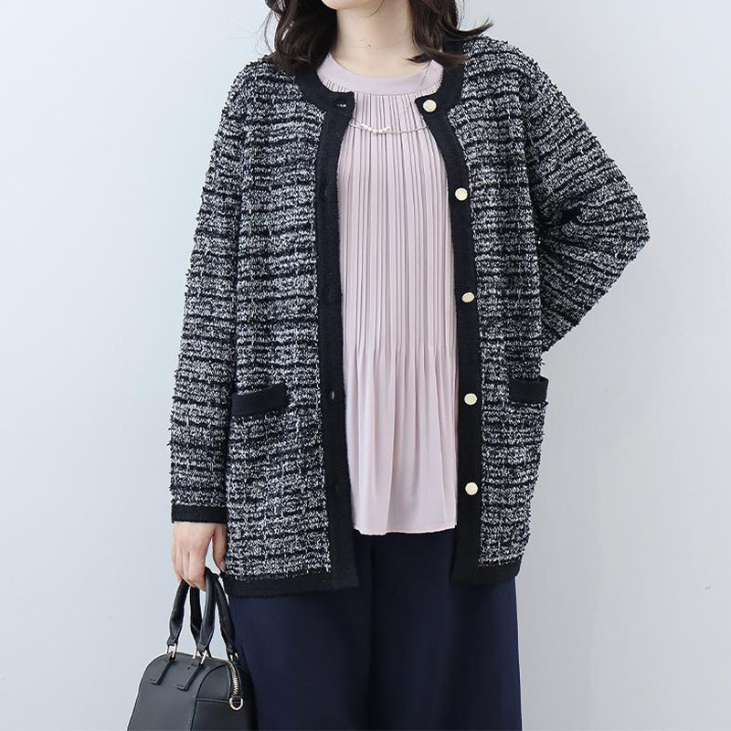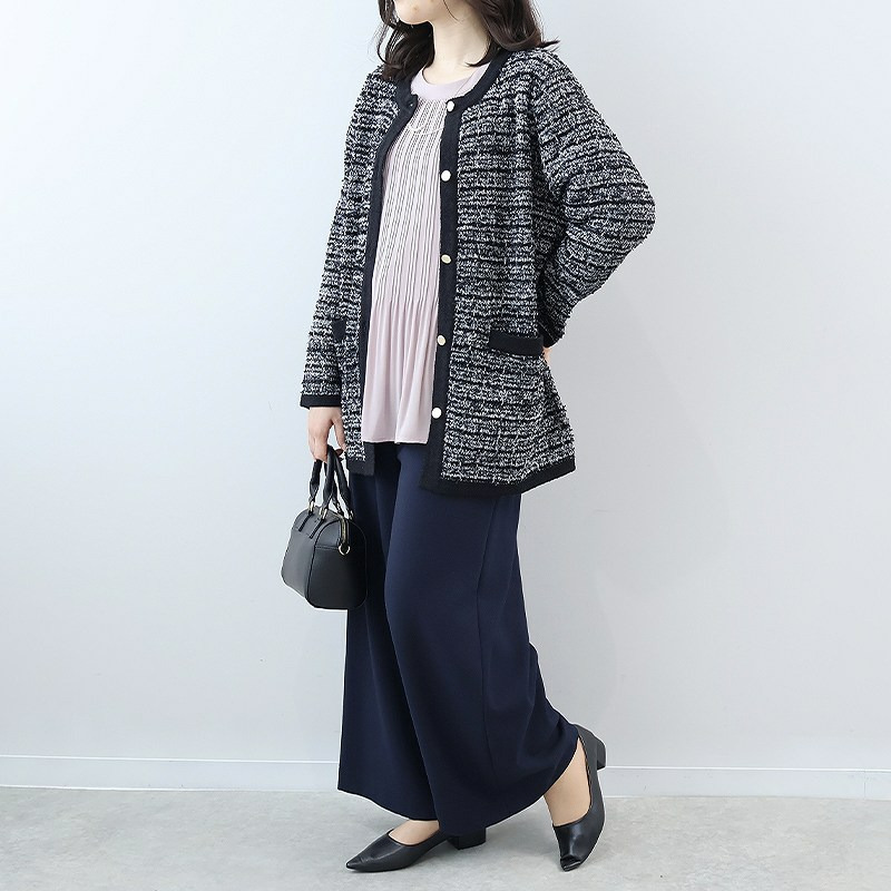 リボンヤーンで編み立てたツイードライクなニットが、華やかでエレガントな印象。