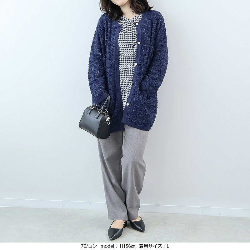 長めの丈感が気になる腰まわりをカバーしつつ、縦長効果でスタイルアップ。