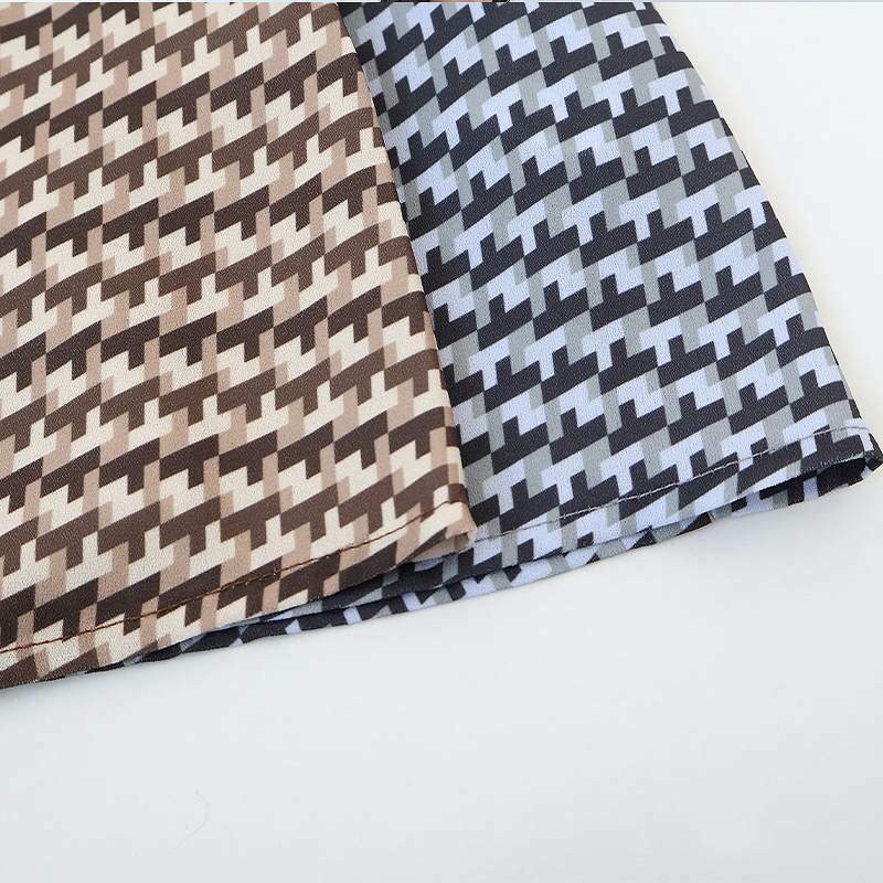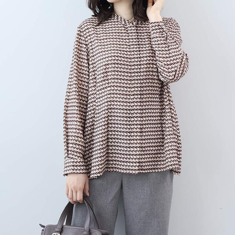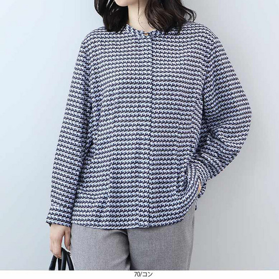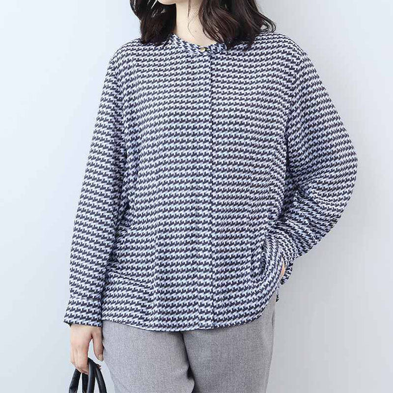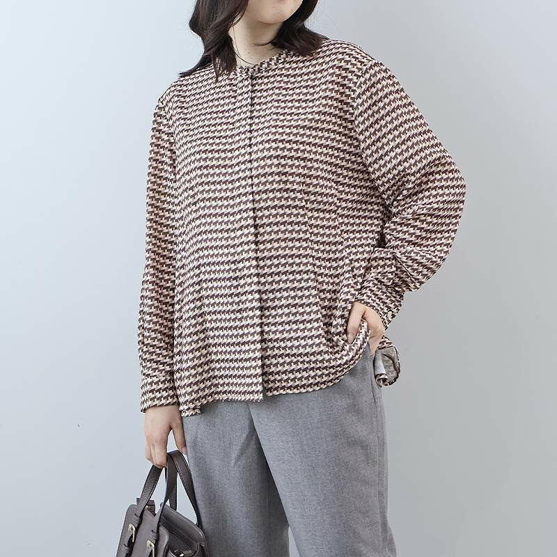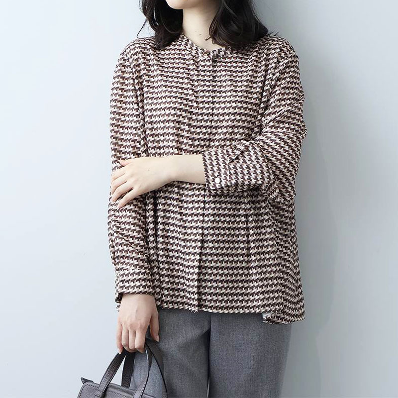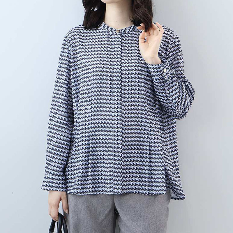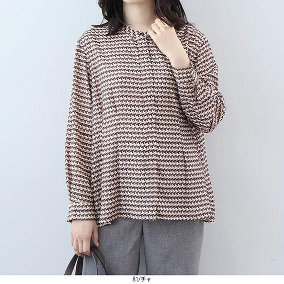 レトロな幾何学柄が目を引く、大人フェミニンなブラウスです。