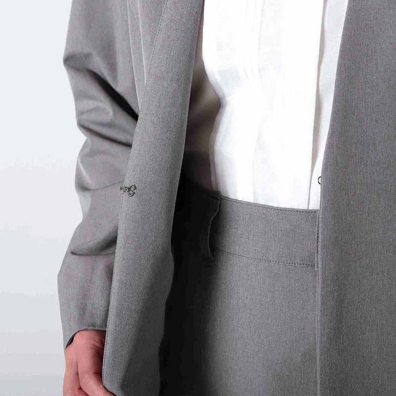 フロントはすっきりとしたホック留め、ポケットは上品な玉縁仕様でセレモニーやビジネスシーンにふさわしい佇まいです。