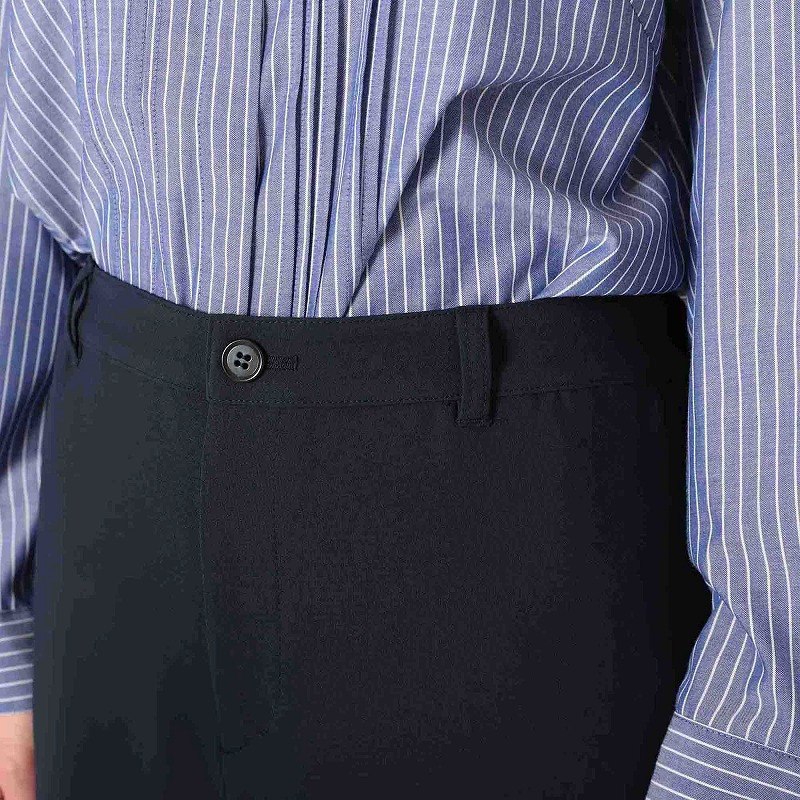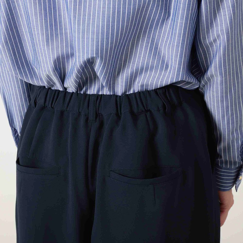 フロントはファスナー開きできちんとした見た目を保ちつつ、後ろウエストはゴム仕様。