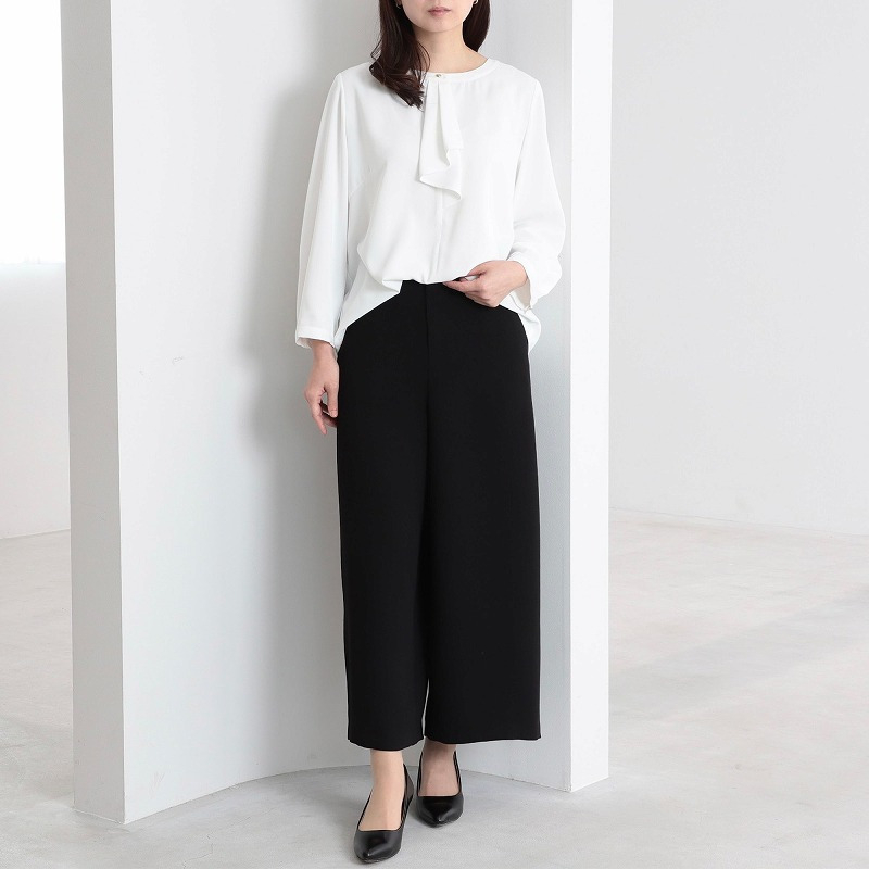 シンプルなニットや、ブラウスのトップスをウエストインして着用いただくと、アンクル丈との相乗効果で脚を長く見せ、オフィススタイルを格上げします。