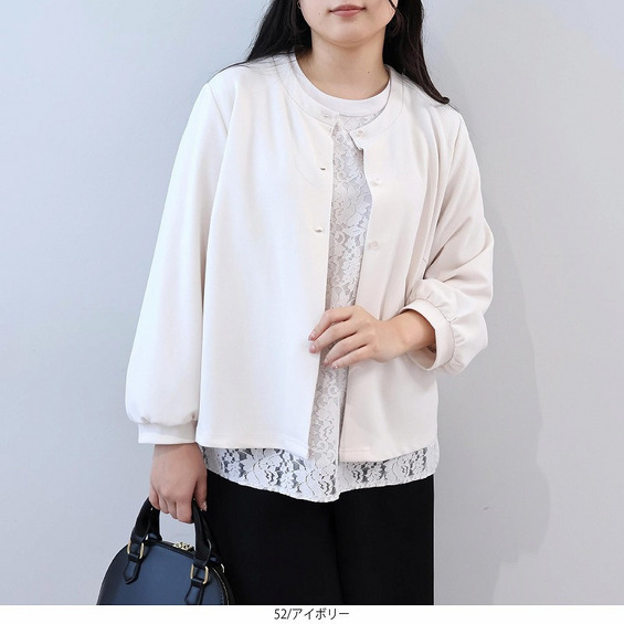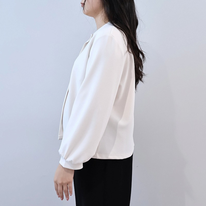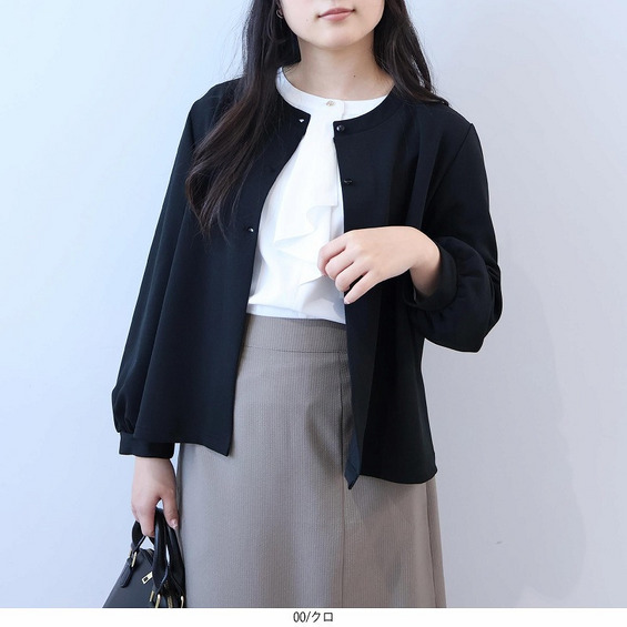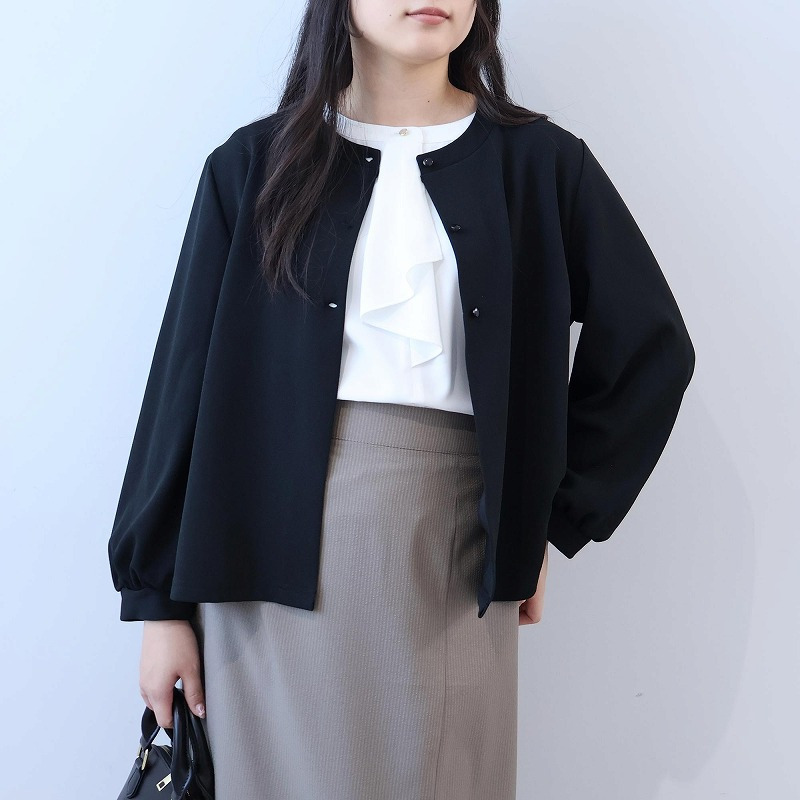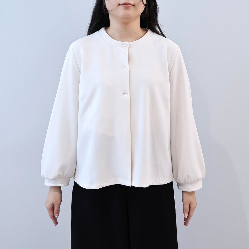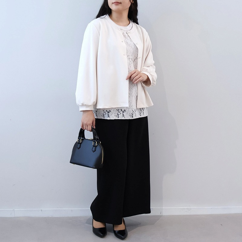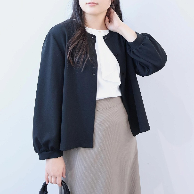 ワンピースやフレアスカートの上から軽く羽織って頂くと、ポワン袖と9分袖丈が女性らしいムードを高め、大人シンプルなフェミニンスタイルに格上げする1枚です。