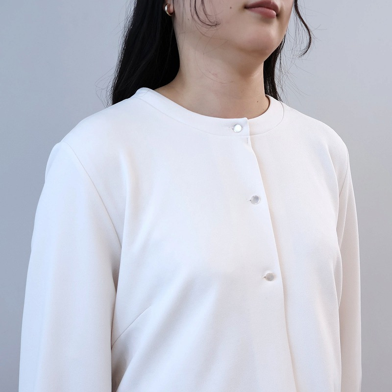 ボタンを全て留めてきちんと感とカットジョーゼットのリラクシーさとラウンドネックのシンプルさで、上品な着こなしが完成します。