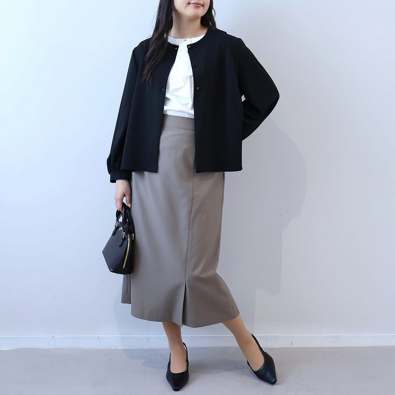 センタープレスワイドパンツやミモレ丈のスカートと合わせて頂くと、ショート丈が重心を上げキレイめなオフィススタイルに。