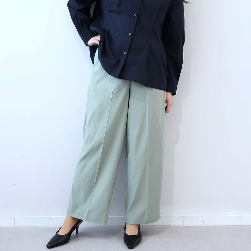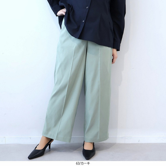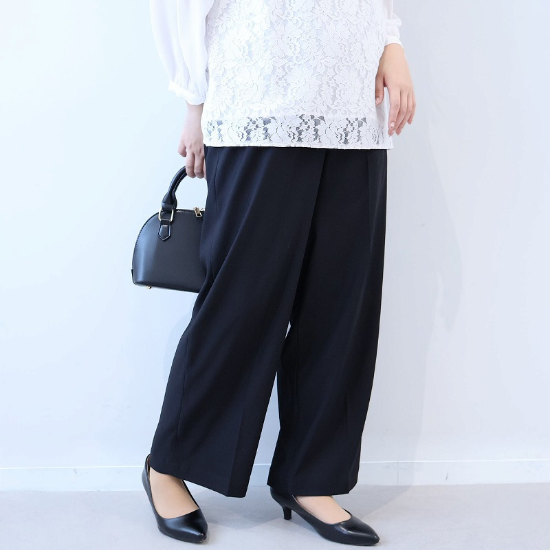 ゆったりとしたワイドパンツシルエットでありながら、縦のラインが視覚的に美脚効果ときちんと感を演出します。