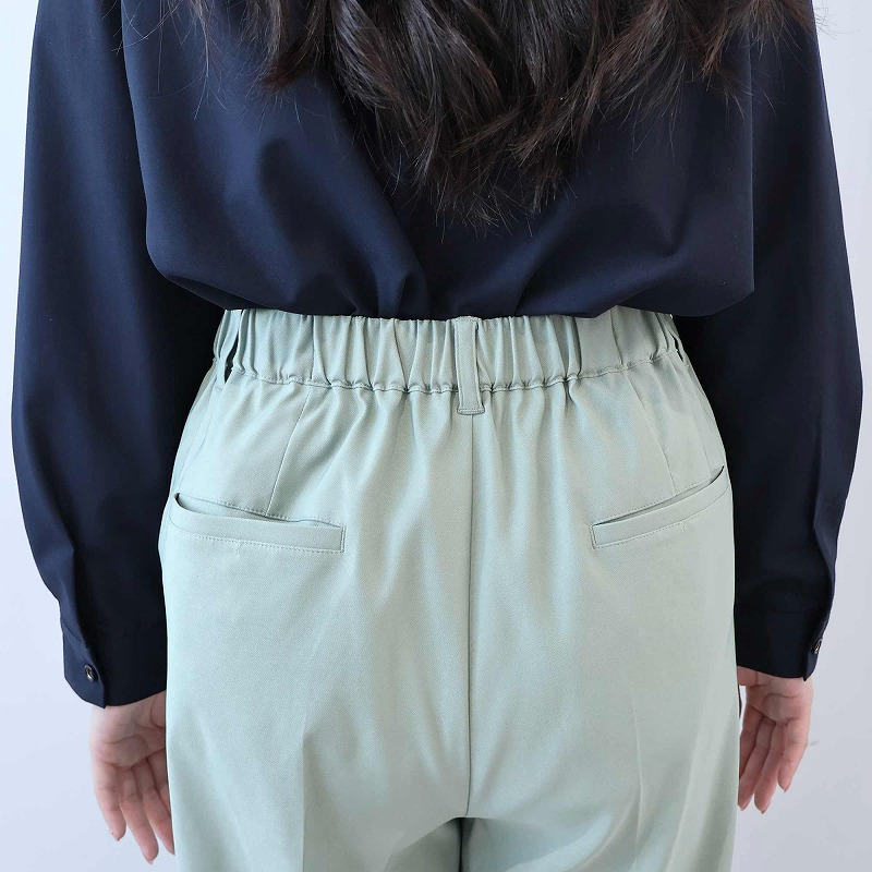最大のポイントはウエストオールゴム仕様でありながら、前ウエストはギャザー無しでスッキリと見えるデザイン。
