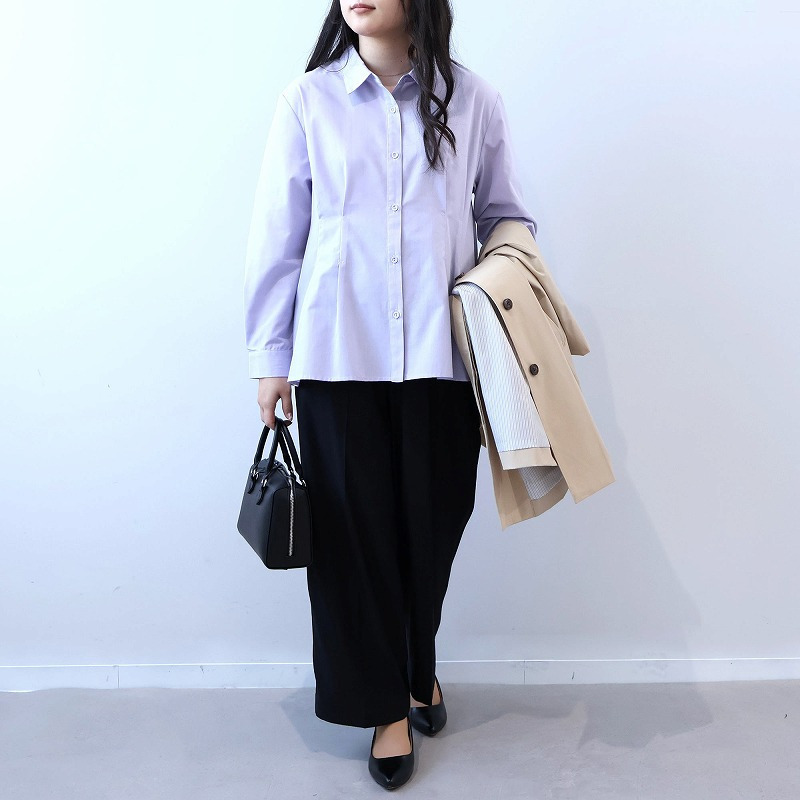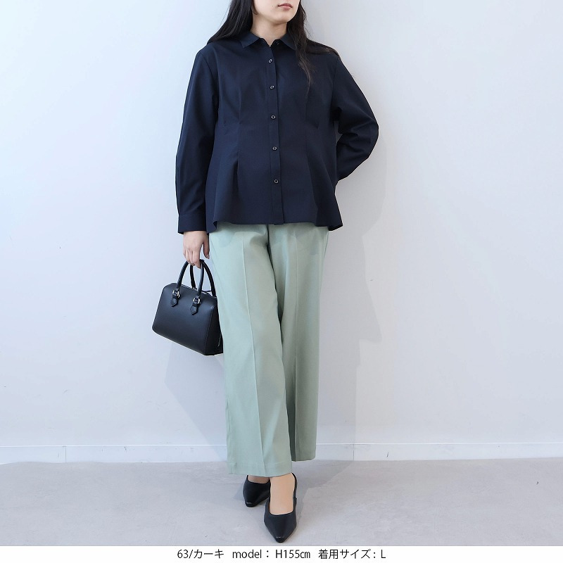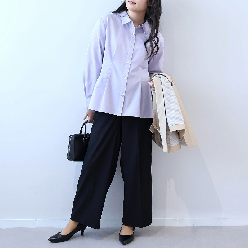 チュニック丈のブラウスや長めの丈のカーディガンと合わせ、パンツのストレートシルエットを活かしたスタイルも、ストレスフリーな通勤着として最適です。