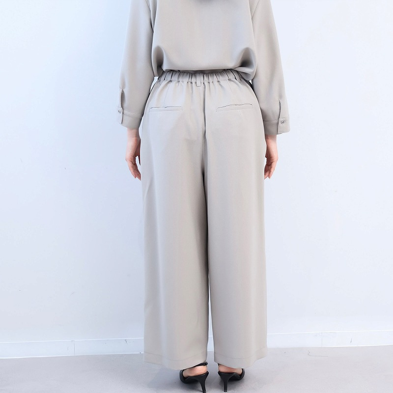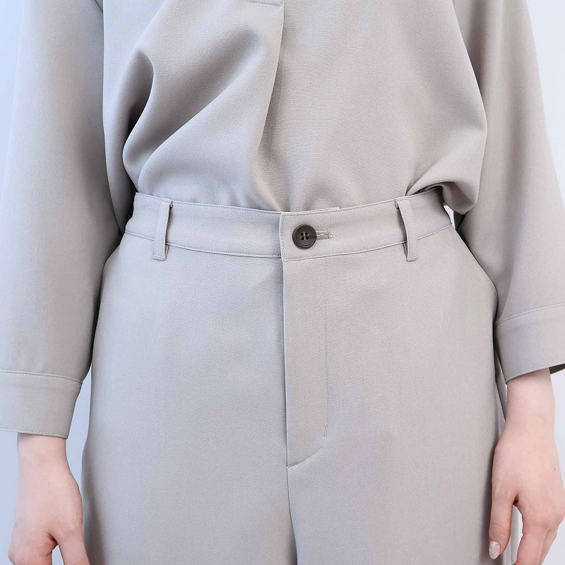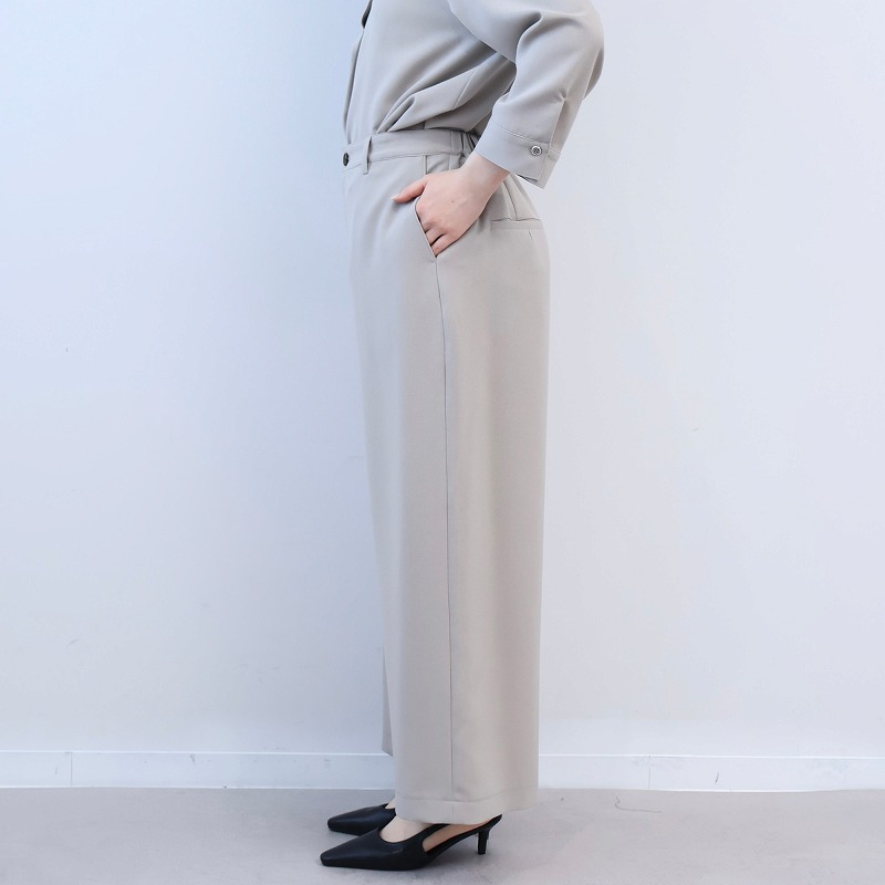 カットレングス丈を活かし、トップスをフロントインして着用いただくと、すっきりワイドシルエットと相まって、より脚長効果が高まります。